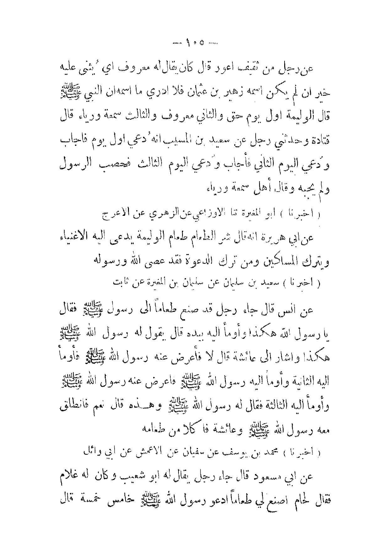 [ 105 ] عن رجل من ثقيف اعور قال كان يقال له معروف اي يثنى عليه خير ان لم يكن اسمه زهير بن عثمان فلا ادري ما اسمه ان النبي صلى الله عليه وسلم قال الوليمة اول يوم حق والثاني معروف والثالث سمعة ورياء قال قتادة وحدثني رجل عن سعيد بن المسيب انه دعي اول يوم فأجاب ودعي اليوم الثاني فأجاب ودعي اليوم الثالث فحصب الرسول ولم يجبه وقال أهل سمعة ورياء