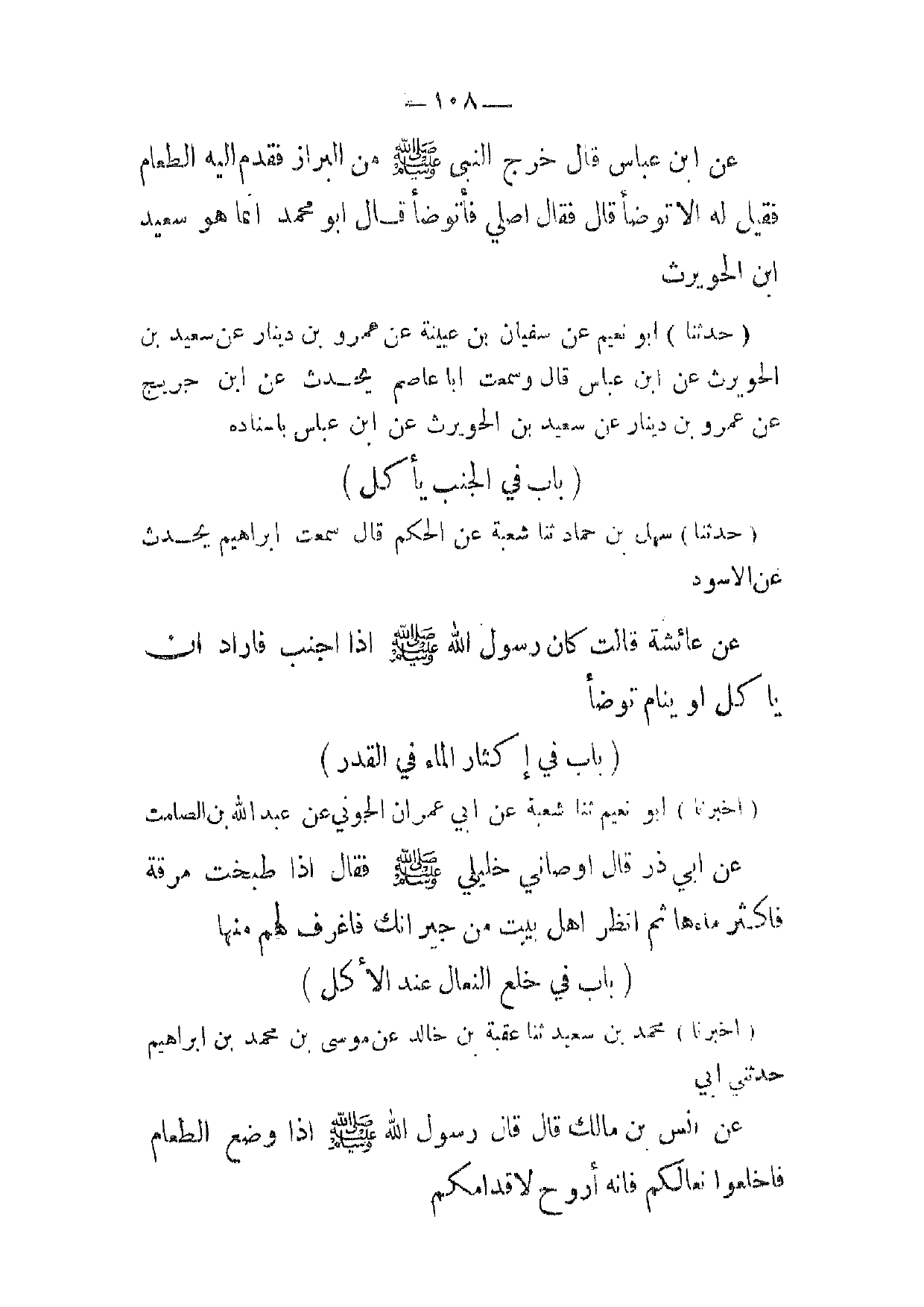[ 108 ] عن ابن عباس قال خرج النبي صلى الله عليه وسلم سمن البراز فقدم إليه الطعام فقيل له الا توضأ قال فقال اصلي فأتوضأ قال أبو محمد انما هو سعيد ابن الحويرث