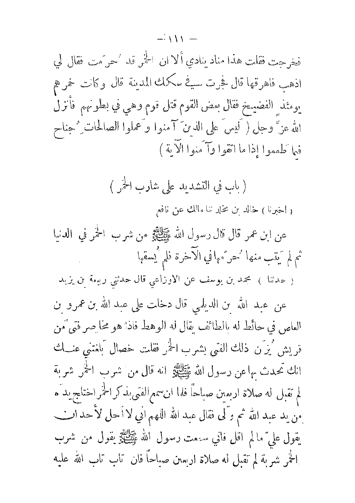 (حدثنا) محمد بن يوسف عن الاوزاعي قال حدثني ربيعة بن يزيد عن عبد الله بن الديلمي قال دخلت على عبد الله بن عمرو بن العاص في حائط له بالطائف يقال له الوهط فإذا هو مخاصرفتى من قريش يزن ذلك الفتى بشرب الخمر فقلت خصال بلغتني عنك انك تحدث بها عن رسول الله صلى الله عليه وسلم انه قال من شرب الخمر شربة لم تقبل له صلاة اربعين صباحا فلما ان سمع الفتى بذكر الخمر اختلج يده من يد عبد الله ثم ولى فقال عبد الله اللهم اني لا أحل لاحدان يقول علي ما لم اقل فاني سمعت رسول الله صلى الله عليه وسلم يقول من شرب الخمر شربة لم تقبل له صلاة اربعين صباحا فان تاب تاب الله عليه