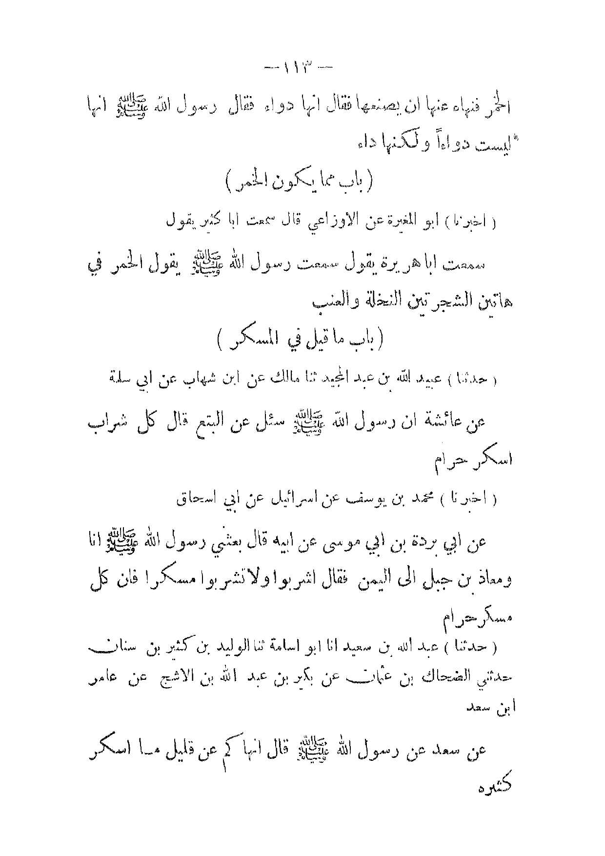 (حدثنا) عبد الله بن سعيد انا أبو اسامة ثنا الوليد بن كثير بن سنان حدثني الضحاك بن عثمان عن بكير بن عبد الله بن الاشج عن عامر ابن سعد عن سعد عن رسول الله صلى الله عليه وسلم قال انها كم عن قليل ما اسكر كثيره