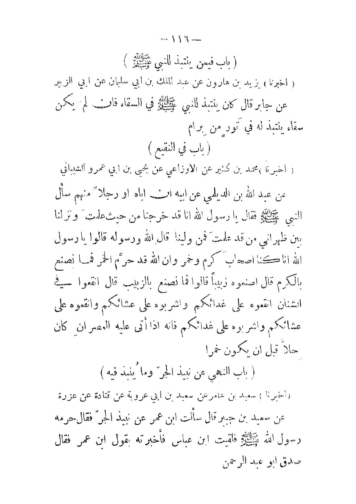 (أخبرنا) يزيد بن هارون عن عبد الملك بن ابي سليمان عن ابي الزبير عن جابر كان ينتبذ للنبي صلى الله عليه وسلم في السقاء فان لم يكن سقاء ينتبذ له في تور من برام