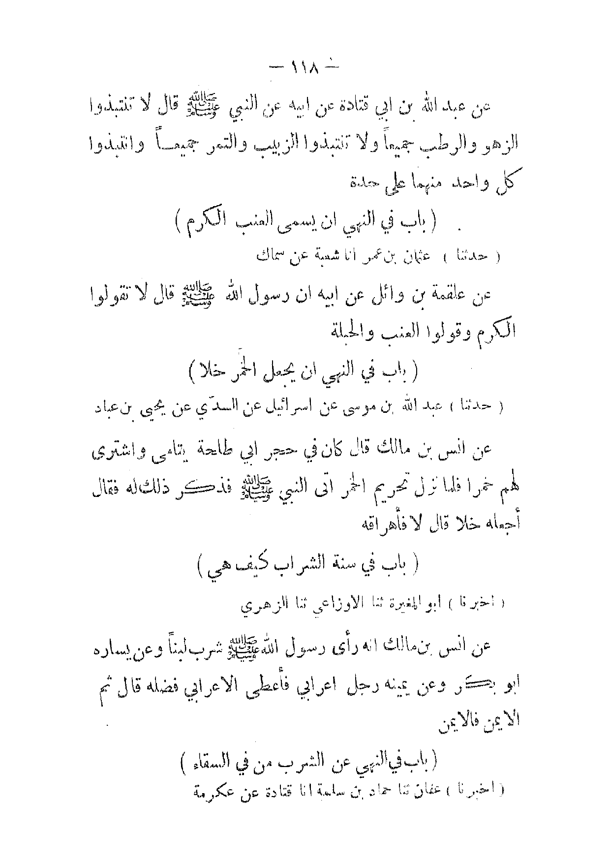 [ 118 ] عن عبد الله بن ابي قتادة عن ابيه عن النبي صلى الله عليه وسلم قال لا تنتبذوا الزهو والرطب جميعا ولا تنتبذوا الزبيب والتمر جميعا وانتبذوا كل واحد منهما على حدة