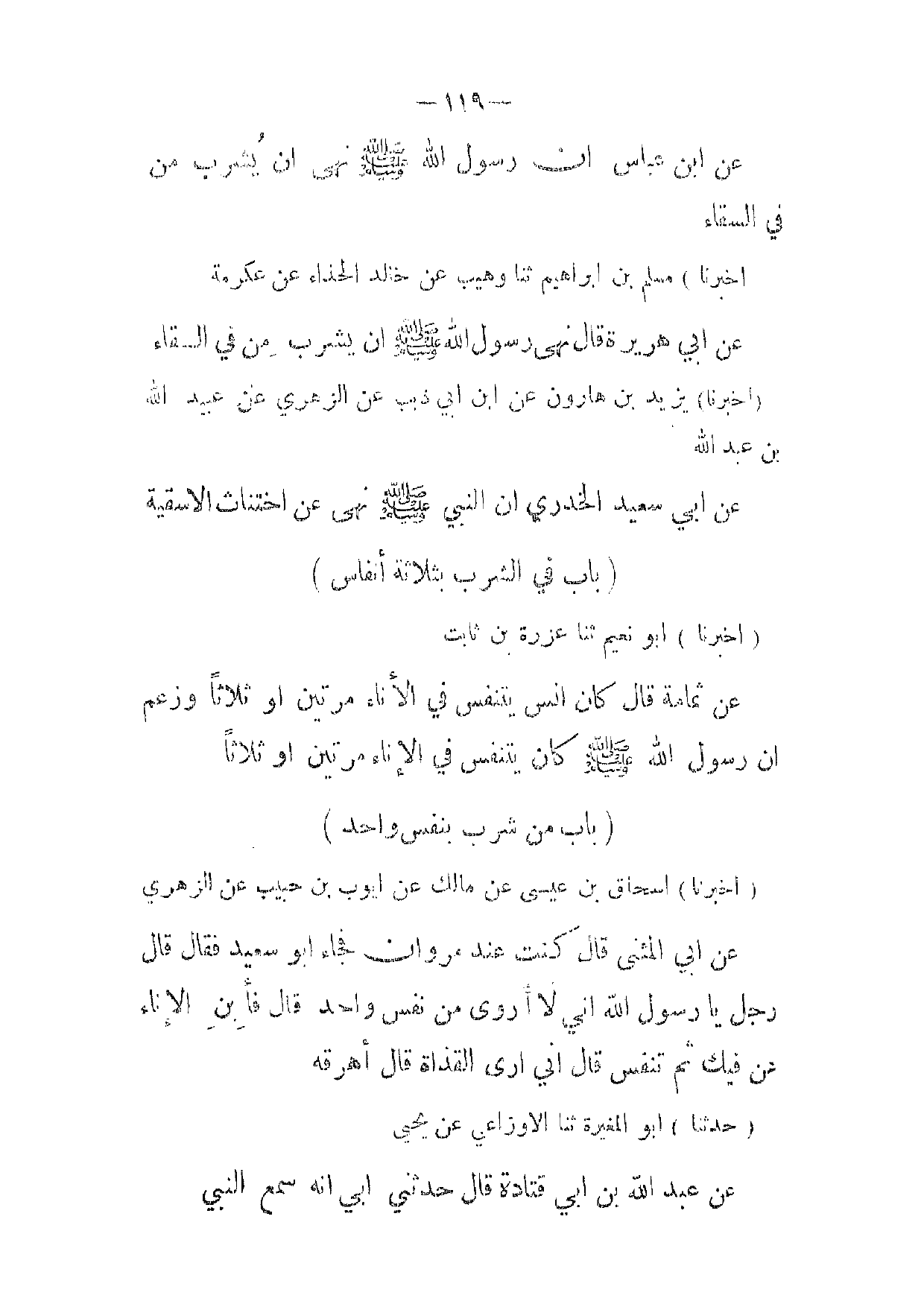 [ 119 ] عن ابن عباس ان رسول الله صلى الله عليه وسلم نهى ان يشرب من في السقاء اخبرنا) مسلم بن ابراهيم ثنا وهيب عن خالد الحذاء عن عكرمة عن ابي هريرة قال نهى رسول الله صلى الله عليه وسلم ان يشرب من في السقاء