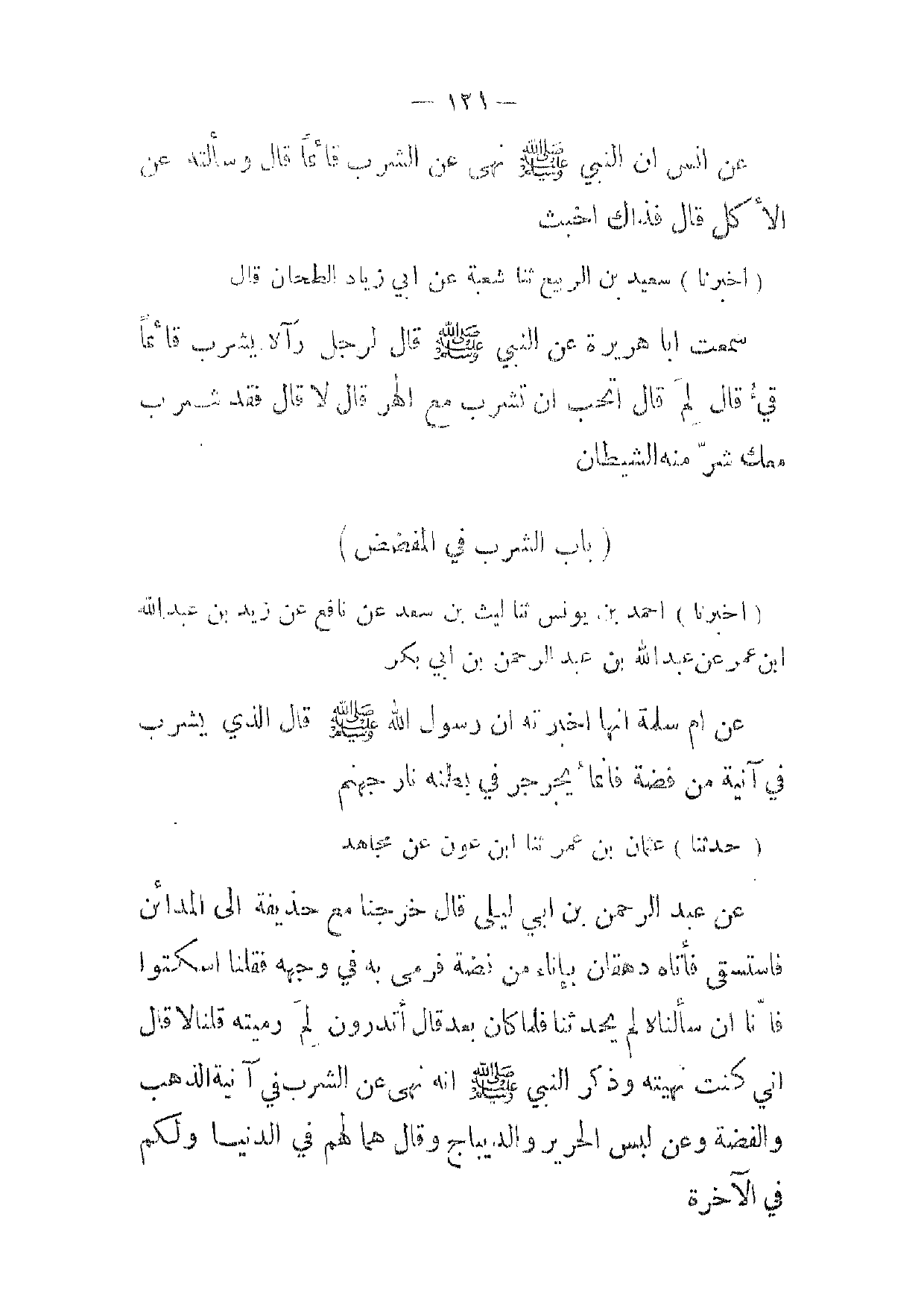 (حدثنا) عثمان بن عمر ثنا ابن عون عن مجاهد عن عبد الرحمن بن ابي ليلى قال خرجنا مع حذيفة إلى المدائن فاستسقى فأتاه دهقان بإناء من نضة فرمى به في وجهه فقلنا اسكتوا فانا ان سألناه لم يحدثنا فلما كان بعد قال أتدرون لم رميته قلنا لا قال اني كنت نهيته وذكر النبي صلى الله عليه وسلم انه نهى عن الشرب في آنية الذهب والفضة وعن لبس الحرير والديباج وقال هما لهم في الدنيا ولكم في الآخرة