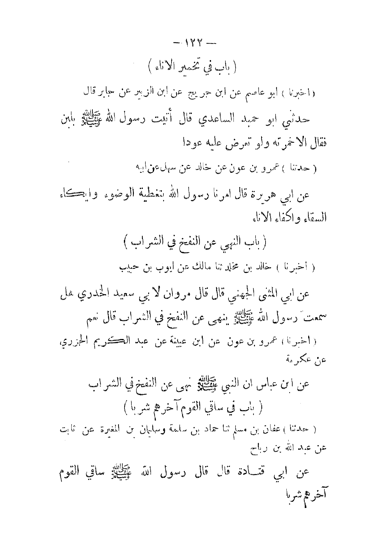 (أخبرنا) أبو عاصم عن ابن جريج عن ابن الزبير عن جابر قال حدثني أبو حميد الساعدي قال أتيت رسول الله صلى الله عليه وسلم بلبن فقال الا خمرته ولو تعرض عليه عودا