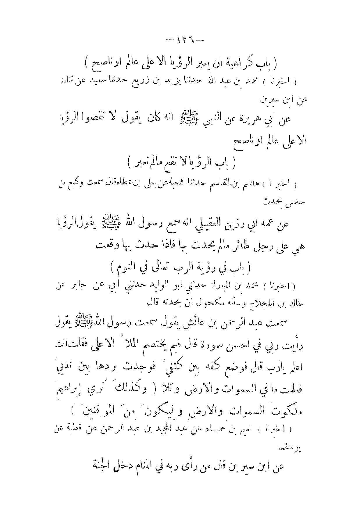 (أخبرنا) نعيم بن حماد عن عبد المجيد بن عبد الرحمن عن قطبة عن يوسف عن ابن سيرين قال من رأى ربه في المنام دخل الجنة