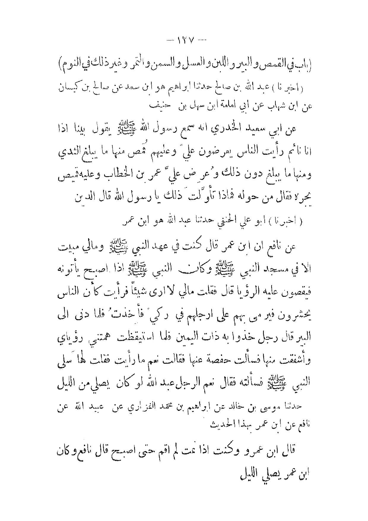 (أخبرنا) أبو علي الحنفي حدثنا عبد الله هو ابن عمر عن نافع ان ابن عمر قال كنت في عهد النبي صلى الله عليه وسلم ومالي مبيت الا في مسجد النبي صلى الله عليه وسلم وكان النبي صلى الله عليه وسلم إذا اصبح يأتونه فيقصون عليه الرؤيا قال فقلت مالي لا ارى شيئا فرأيت كأن الناس يحشرون فيرمى بهم على ارجلهم في ركي فأخذت فلما دنى إلى البير قال رجل خذوا به ذات اليمين فلما استيقظت همتني رؤياي وأشفقت منها فسألت حفصة عنها فقالت نعم ما رأيت فقلت لها سلي النبي صلى الله عليه وسلم فسألته فقال نعم الرجل عبد الله لو كان يصلي من الليل حدثنا موسى بن خالد عن ابراهيم بن محمد الفزاري عن عبيدالله عن نافع عن ابن عمر بهذا الحديث قال ابن عمرو وكنت إذا نمت لم اقم حتى اصبح قال نافع وكان ابن عمر يصلي الليل