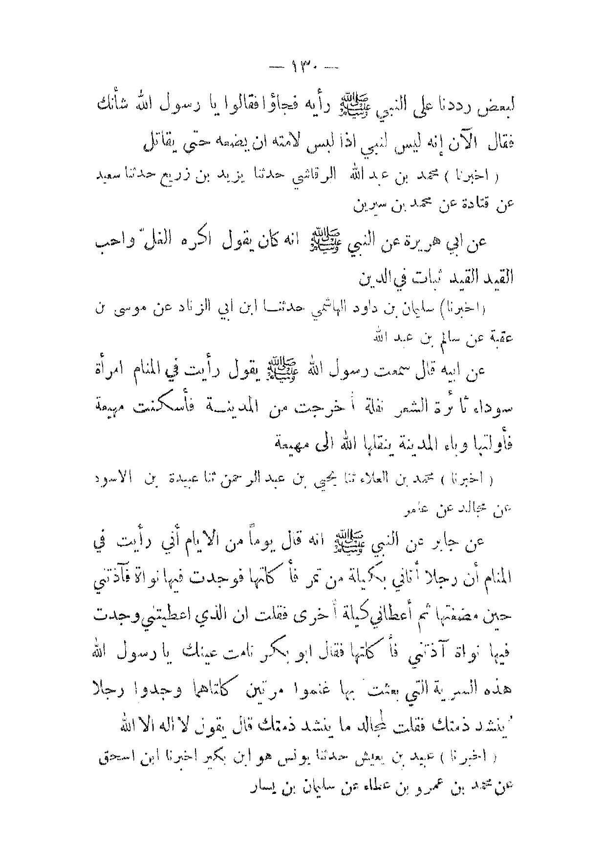 (أخبرنا) محمد بن العلاء ثنا يحيى بن عبد الرحمن ثنا عبيدة بن الاسود عن مجالد عن عامر عن جابر عن النبي صلى الله عليه وسلم انه قال يوما من الايام أني رأيت في المنام أن رجلا أتاني بكيلة من تمر فأكلتها فوجدت فيها نواة فآذتني حين مضغتها ثم أعطاني كيلة أخرى فقلت ان الذي اعطيتني وجدت فيها نواة آذتني فأكلتها فقال أبو بكر نامت عينك يا رسول الله هذه السرية التي بعثت بها غنموا مرتين كلتاهما وجدوا رجلا ينشد ذمتك فقلت لمجالد ما ينشد ذمتك قال يقول لا اله الا الله