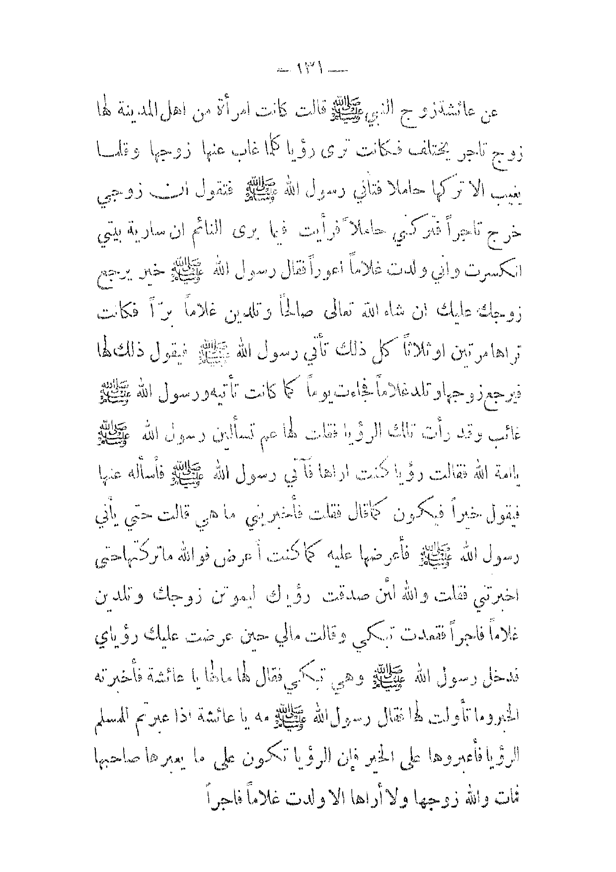 [ 131 ] عن عائشة زوج النبي صلى الله عليه وسلم قالت كانت امرأة من اهل المدينة لها زوج تاجر يختلف فكانت ترى رؤيا كلما غاب عنها زوجها وقلما يغيب الا تركها حاملا فتأني رسول الله صلى الله عليه وسلم فتقول ان زوجي خرج تاجرا فتركني حاملا فرأيت فيما يرى النائم ان سارية بيتي انكسرت واني ولدت غلاما اعورا فقال رسول الله صلى الله عليه وسلم خير يرجع زوجك عليك ان شاء الله تعالى صالحا وتلدين غلاما برا فكانت تراها مرتين أو ثلاثا كل ذلك تأتي رسول الله صلى الله عليه وسلم فيقول ذلك لها فيرجع زوجها وتلد غلاما فجاءت يوما كما كاانت تأتيه ورسول الله صلى الله عليه وسلم غائب وقد رأت تلك الرؤيا فقلت لها عم تسألين رسول الله صلى الله عليه وسلم يا امة الله فقالت رؤيا كنت اراها فآتي رسول الله صلى الله عليه وسلم فأسأله عنها فيقول خيرا فيكون كما قال فقلت فأخبريني ما هي قالت حتي يأني رسول الله صلى الله عليه وسلم فأعرضها عليه كما كنت أعرض فوالله ما تركتها حتى اخبرتني فقلت والله لئن صدقت رؤياك ليموتن زوجك وتلدين غلاما فاجرا فقعدت تبكي وقالت مالي حين عرضت عليك رؤياي فدخل رسول الله صلى الله عليه وسلم وهي تبكي فقال لها مالها يا عائشة فأخبرته الخبر وما تأولت لها فقال رسول الله صلى الله عليه وسلم مه يا عائشة إذا عبرتم للمسلم الرؤيا فأعبروها على الخير فإن الرؤيا تكون على ما يعبرها صاحبها فمات والله زوجها ولا أراها الا ولدت غلاما فاجرا