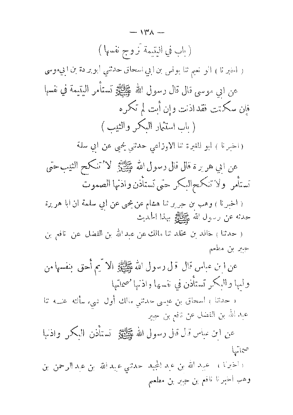 (حدثنا) اسحاق بن عيسى حدثني مالك أول شئ سألته عنه ثنا عبد الله بن الفضل عن نافع بن جبير عن ابن عباس قال قال رسول الله صلى الله عليه وسلم تستأذن البكر واذنها صماتها