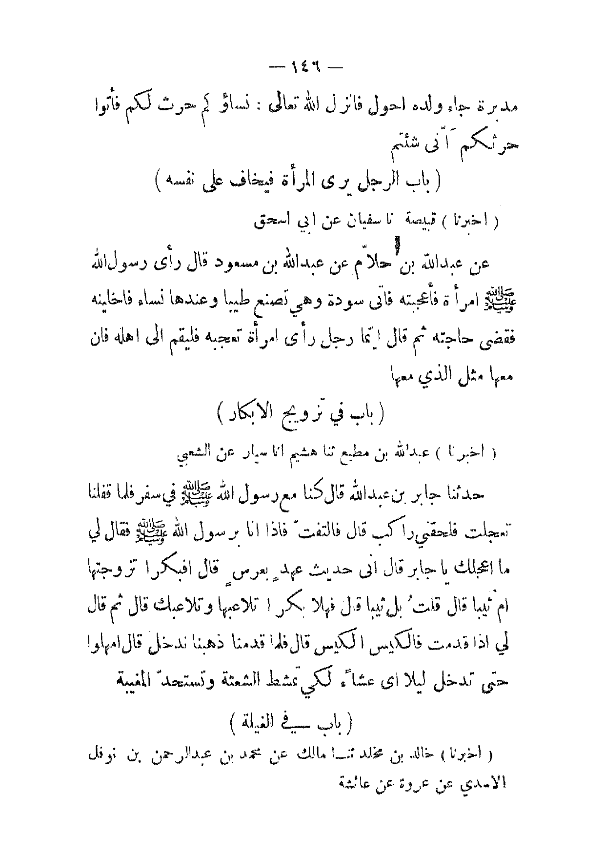 (أخبرنا) عبد الله بن مطيع ثنا هشيم انا سيار عن الشعبي حدثنا جابر بن عبد الله قال كنا مع رسول الله صلى الله عليه وسلم في سفر فلما قفلنا تعجلت فلحقني راكب قال فالتفت فإذا انا برسول الله صلى الله عليه وسلم فقال لي ما اعجلك يا جابر قال انى حديث عهد بعرس قال افبكرا تزوجتها ام ثيبا قال قلت بل ثيبا قال فهلا بكرا تلاعبها وتلاعبك قال ثم قال لي إذا قدمت فالكيس الكيس قال فلما قدمنا ذهبنا ندخل قال امهلوا حتى تدخل ليلا أي عشاء لكي تمشط الشعثة وتستحد المغيبة