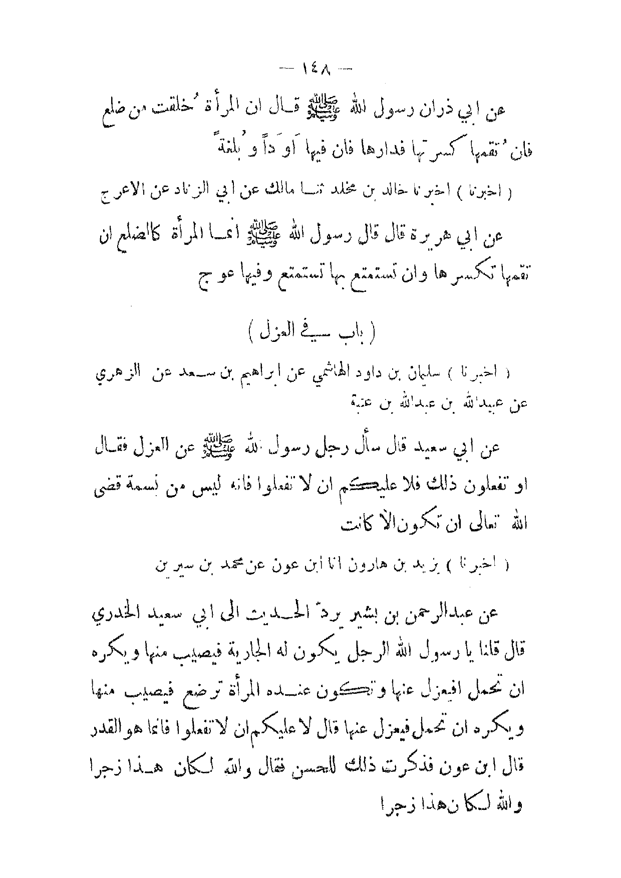 (أخبرنا) سليمان بن داود الهاشمي عن ابراهيم بن سعد عن الزهري عن عبيدالله بن عبد الله بن عتبة عن ابي سعيد قال سأل رجل رسول الله صلى الله عليه وسلم عن العزل فقال أو تفعلون ذلك فلا عليكم ان لا تفعلوا فانه ليس من نسمة قضى الله تعالى ان تكون الا كانت