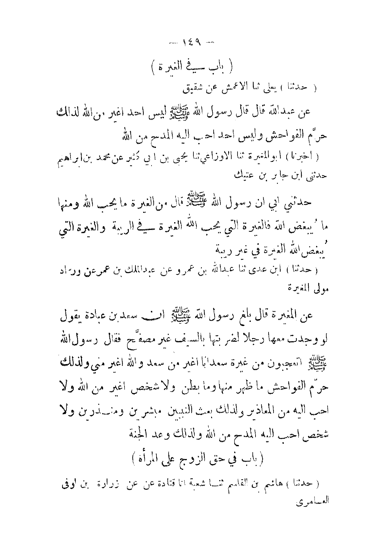 (حدثنا) ابن عدى ثنا عبد الله بن عمرو عن عبد الملك بن عمر عن وراد مولى المغيرة عن المغيرة قال بلغ رسول الله صلى الله عليه وسلم ان سعد بن عبادة يقول لو وجدت معها رجلا لضربتها بالسيف غير مصفح فقال رسول الله صلى الله عليه وسلم اتعجبون من غيرة سعد انا اغير من سعد والله اغير مني ولذلك حرم الفواحش ما ظهر منها وما بطن ولا شخص اغير من الله ولا احب إليه من المعاذير ولذلك بعث النبيين مبشرين ومنذرين ولا شخص احب إليه المدح من الله ولذلك وعد الجنة