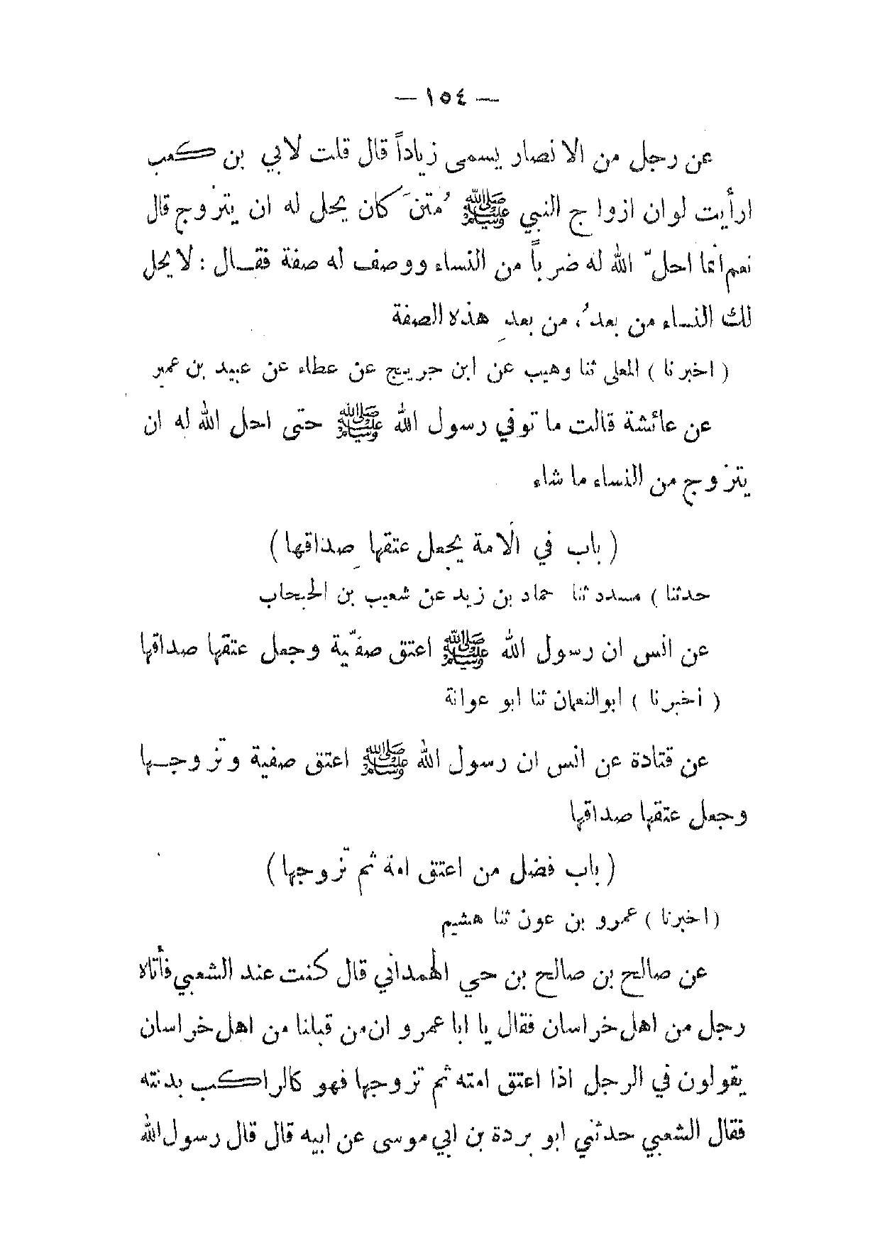 (أخبرنا) عمرو بن عون ثنا هشيم عن صالح بن صالح بن حي الهمداني قال كنت عند الشعبي فأتاه رجل من اهل خراسان فقال يا ابا عمرو ان من قبلنا من اهل خراسان يقولون في الرجل إذا اعتق امته ثم تزوجعا فهو كالراكب بدنته فقال الشعبي حدثني أبو بردة بن ابي موسى عن ابيه قال قال رسول الله