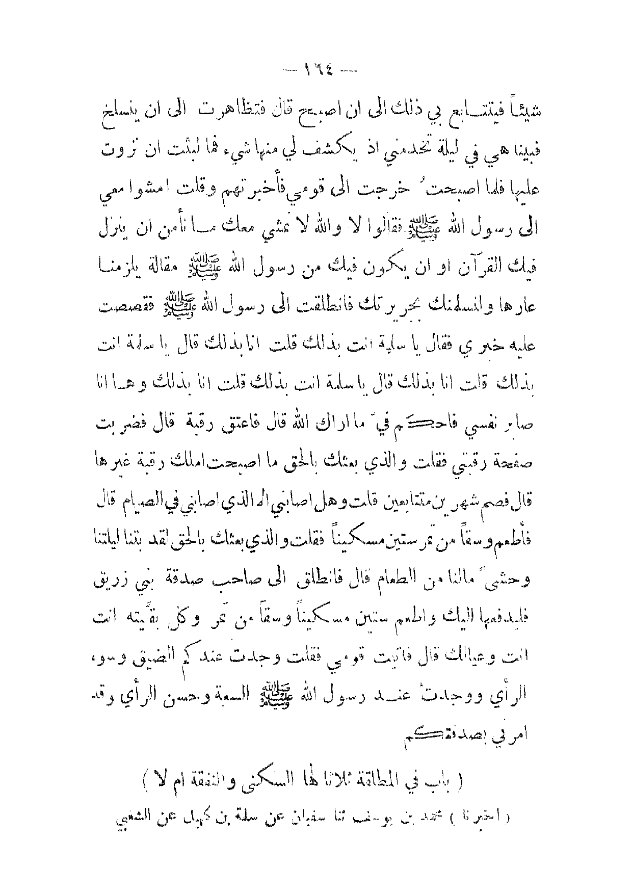 [ 164 ] شيئا فيتتابع بي ذلك إلى ان اصبح قال فتظاهرت إلى ان ينسلخ فبينا هي في ليلة تخدمني إذ يكشف لي منها شئ فما لبثت ان نزوت عليها فلما اصبحت خرجت إلى قومي فأخبرتهم وقلت امشوا معي إلى رسول الله صلى الله عليه وسلم فقالوا لا والله لا نمشي معك ما نأمن ان ينزل فيك القرآن أو ان يكون فيك من رسول الله صلى الله عليه وسلم مقالة يلزمنا عارها ولنسلمنك بجرير تك فانطلقت إلى رسول الله صلى الله عليه وسلم فقصصت عليه خبري فقال يا سلمة انت بذلك قلت انا بذلك قال يا سلمة انت بذلك قلت انا بذلك قال يا سلمة انت بذلك قلت انا بذلك وها انا صابر نفسي فاحكم في ما اراك الله قال فاعتق رقبة قال فضربت صفحة رقبتي فقلت والذي بعثك بالحق ما اصبحت املك رقبة غيرها قال فصم شهرين متتابعين قلت وهل اصابني الا الذي اصابني في الصيام قال فأطعم وسقا من تمر ستين مسكينا فقلت والذي بعثك بالحق لقد بتنا ليلتنا وحشى مالنا من الطعام قال فانطلق إلى صاحب صدقة بني زريق فليدفعها اليك واطعم ستين مسكينا وسقا من تمر وكل بقيته انت انت وعيالك قال فاتيت قومي فقلت وجدت عندكم الضيق وسوء الرأي ووجدت عند رسول الله صلى الله عليه وسلم السعة وحسن الرأي وقد امرني بصدقتكم