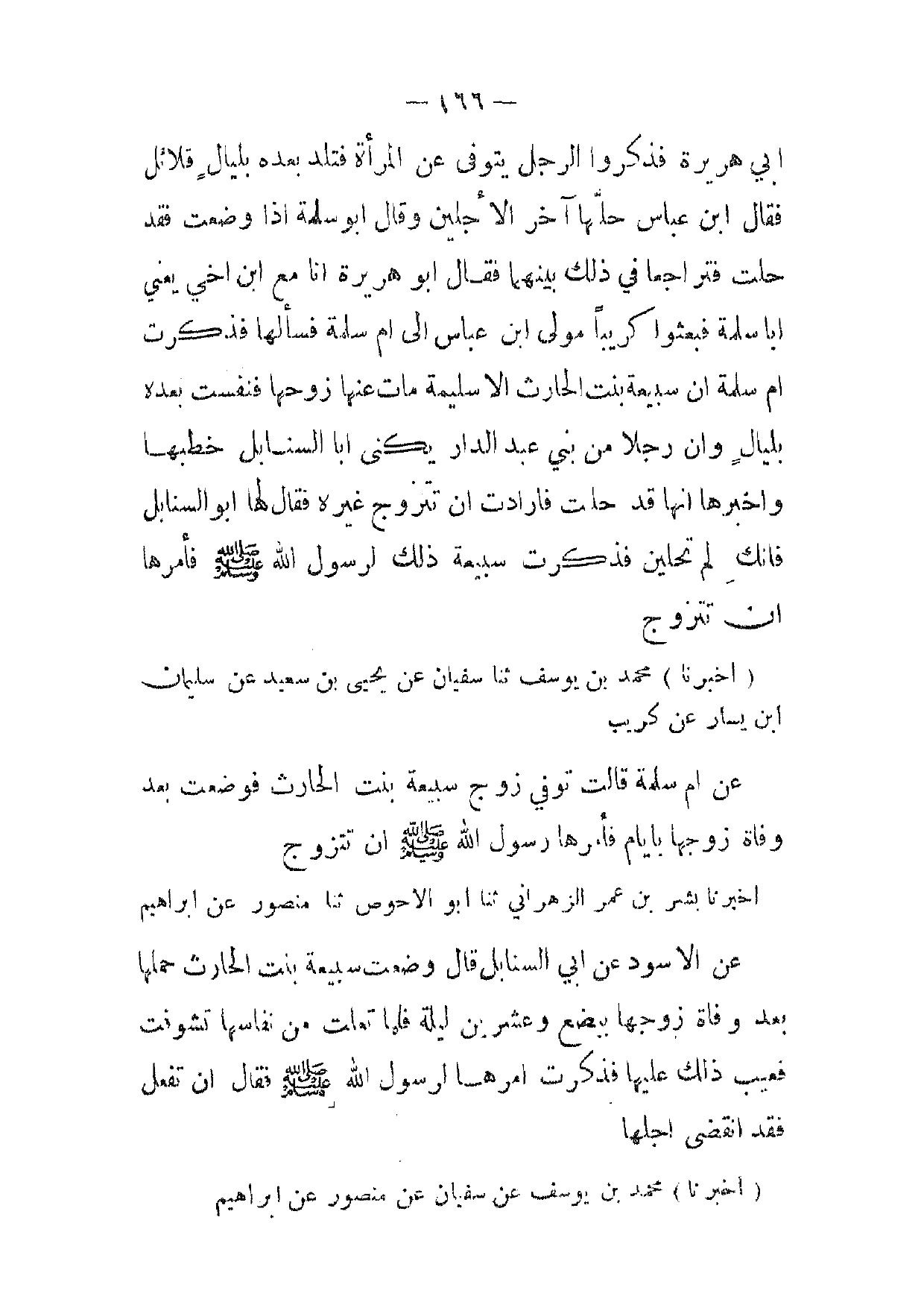 [ 166 ] ابي هريرة فذكروا الرجل يتوفى عن المرأة فتلد بعده بليال قلائل فقال ابن عباس حلها آخر الاجلين وقال أبو سلمة إذا وضعت فقد حلت فتراجعا في ذلك بينهما فقال أبو هريرة انا مع ابن اخي يعني ابا سلمة فبعثوا كريبا مولى ابن عباس إلى ام سلمة فسألها فذكرت ام سلمة ان سبيعة بنت الحارث الا سليمة مات عنها زوحها فنفست بعده بليال وان رجلا من بني عبد الدار يكنى ابا السنابل خطبها واخبرها انها قد حلت فارادت ان تتزوج غيره فقال لها أبو السنابل فانك لم تحلين فذكرت سبيعة ذلك لرسول الله صلى الله عليه وسلم فأمرها ان تتزوج