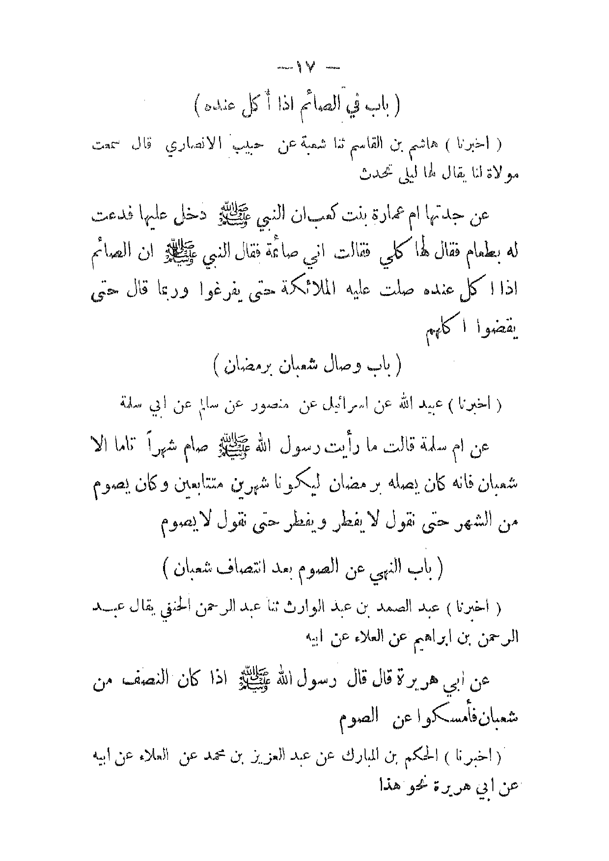 (أخبرنا) عبد الصمد بن عبد الوارث ثنا عبد الرحمن الحنفي يقال عبد الرحمن بن ابراهيم عن العلاء عن ابيه عن ابي هريرة قال قال رسول الله صلى الله عليه وسلم إذا كان النصف من شعبان فأمسكوا عن الصوم