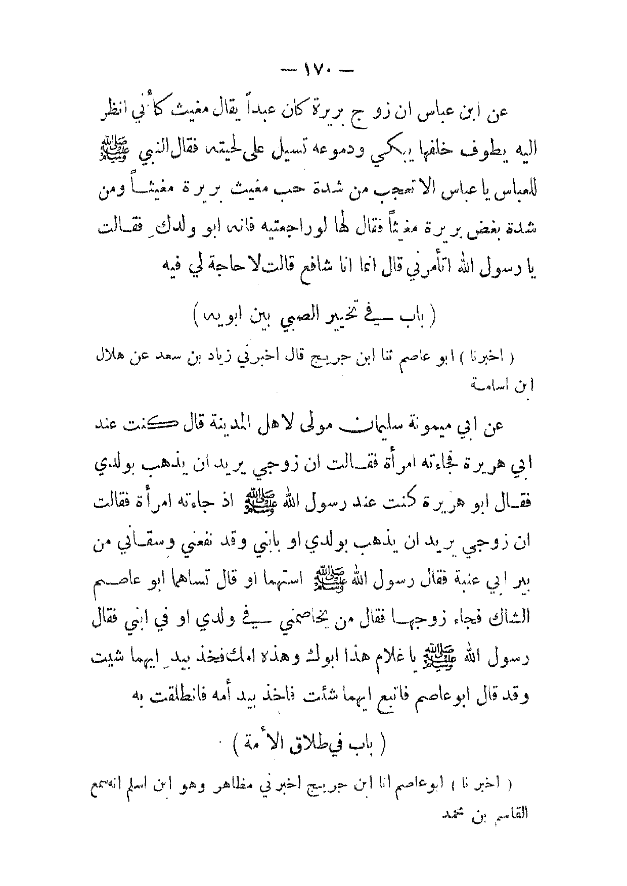 [ 170 ] عن ابن عباس ان زوج بريرة كان عبدا يقال مغيث كأني انظر إليه يطوف خلفها يبكي ودموعه تسيل على لحيته فقال النبي صلى الله عليه وسلم للعباس يا عباس الا تعجب من شدة حب مغيث بريرة مغثيا ومن شدة بغض بريرة مغيثا فقال لها لو راجعتيه فانه أبو ولدك فقالت يا رسول الله اتأمرني قال انما انا شافع قالت لا حاجة لي فيه