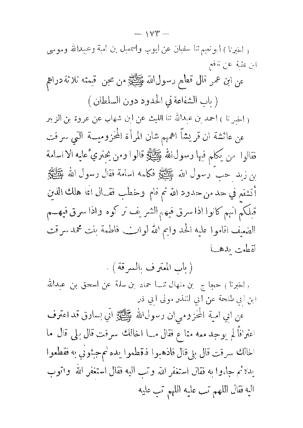(أخبرنا) احمد بن عبد الله ثنا الليث عن ابن شهاب عن عروة بن الزبير عن عائشة ان قريشا اهمهم شان المرأة المخزومية التي سرقت فقالوا من يكلم فيها رسول الله صلى الله عليه وسلم قالوا ومن يجترئ عليه الا اسامة بن زيد حب رسول الله صلى الله عليه وسلم فكلمه اسامة فقال رسول الله صلى الله عليه وسلم أتشفع في حد من حدود الله ثم قام وخطب فقال انما هلك الذين قبلكم انهم كانوا إذا سرق فيهم الشريف تركوه وإذا سرق فيهم الضعيف اقاموا عليه الحد وايم الله لو ان فاطمة بنت محمد سرقت لقطعت يدها