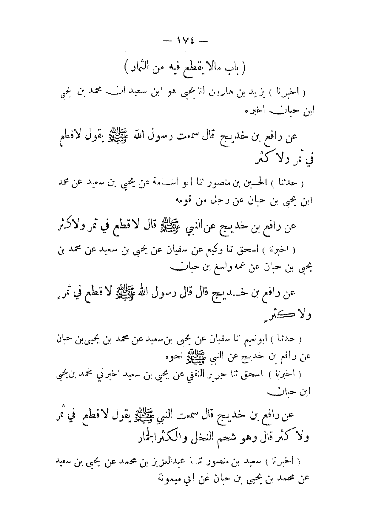 (أخبرنا) اسحق ثنا وكيع عن سفيان عن يحيى بن سعيد عن محمد بن يحيى بن حبان عن عمه واسع بن حبان عن رافع بن خديج قال قال رسول الله صلى الله عليه وسلم لاقطع في ثمر ولا كثر