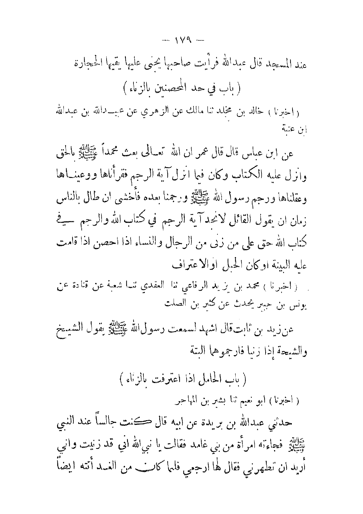(أخبرنا) خالد ببن مخلد ثنا مالك عن الزهري عن عبيدالله بن عبد الله ابن عتبة عن ابن عباس قال قال عمر ان الله تعالى بعث محمدا صلى الله عليه وسلم بالحق وانزل عليه الكتاب وكان فيما انزل آية الرجم فقرأناها ووعيناها وعقلناها ورجم رسول الله صلى الله عليه وسلم ورجمنا بعده فأخشى ان طال بالناس زمان ان يقول القائل لا نجد آية الرجم في كتاب الله والرجم في كتاب الله حق على من زنى من الرجال والنساء إذا احصن إذا قامت عليه البينة أو كان الحبل أو الاعتراف