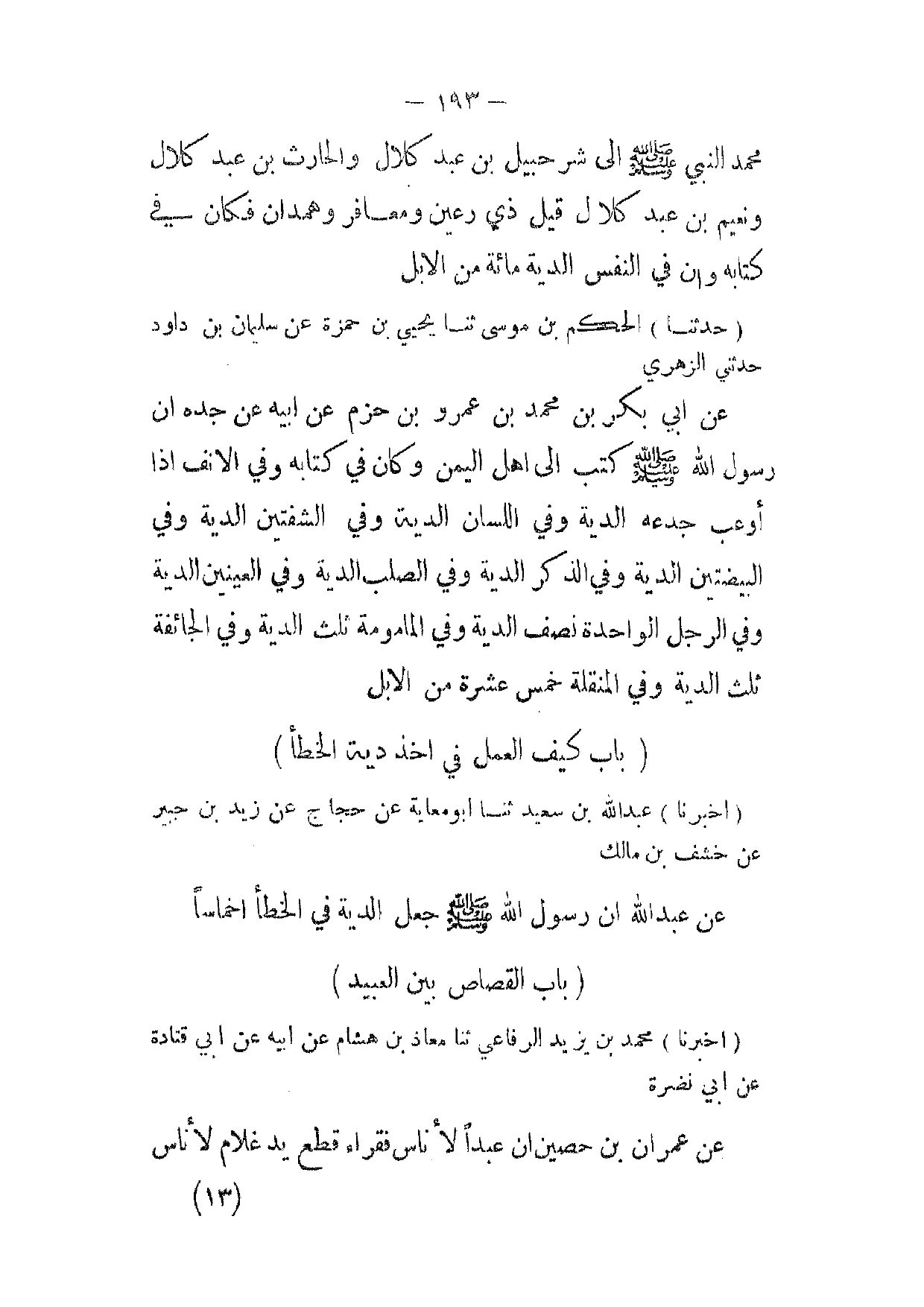 [ 193 ] محمد النبي صلى الله عليه وسلم إلى شرحبيل بن عبد كلال والحارث بن عبد كلال ونعيم بن عبد كلال قيل ذي رعين ومعافر وهمدان فكان في كتابه وان في النفس الدية مائة من الابل