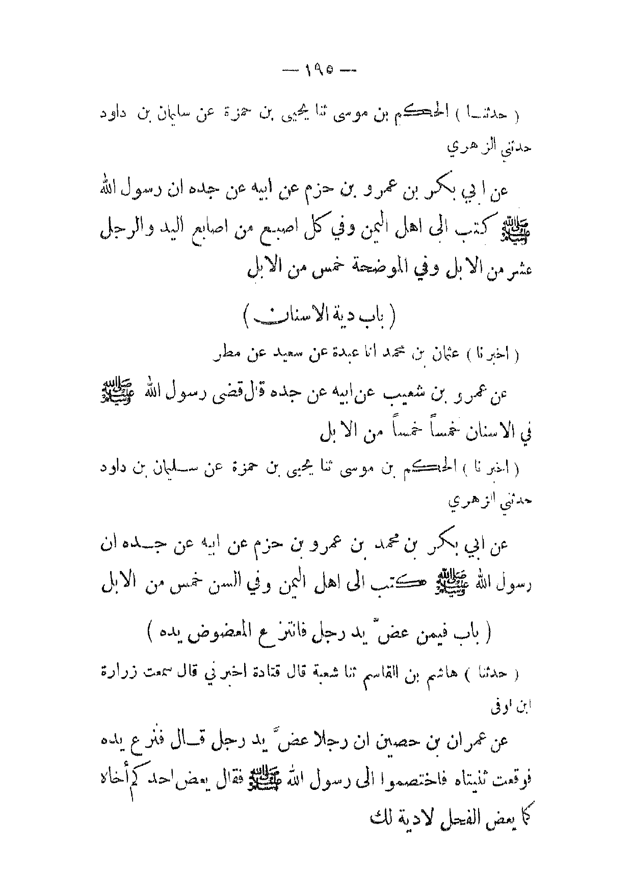 (حدثنا) الحكم بن موسى ثنا يحيى بن حمزة عن سليمان بن داود حدثني الزهري عن ابي بكر بن عمرو بن حزم عن ابيه عن جده ان رسول الله صلى الله عليه وسلم كتب إلى اهل اليمن وفي كل اصبع من اصابع اليد والرجل عشر من الابل وفي الموضحة خمس من الابل