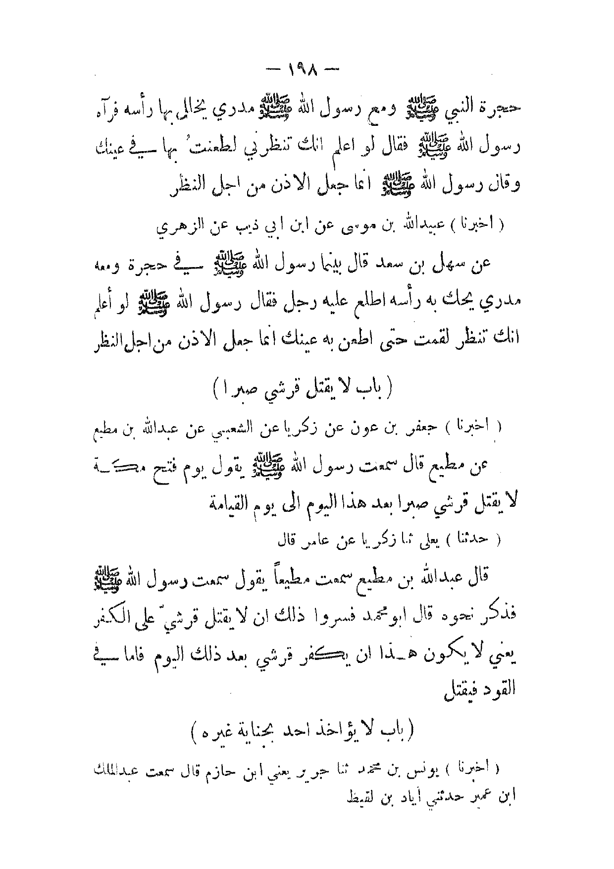 [ 198 ] حجرة النبي صلى الله عليه وسلم ومع رسول الله صلى الله عليه وسلم مدري يخلل بها رأسه فرآه رسول الله صلى الله عليه وسلم فقال لو اعلم انك تنظرني لطعنت بها في عينك وقال رسول الله صلى الله عليه وسلم انما جعل الاذن من اجل النظر
