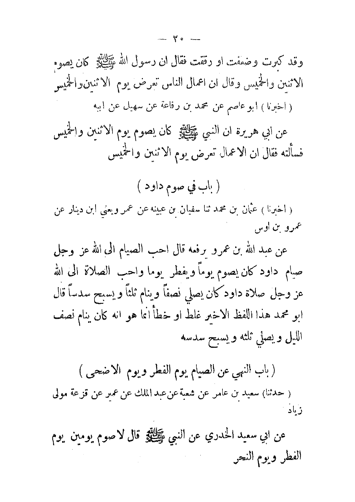 (أخبرنا) عثمان بن محمد ثنا سفيان بن عيينه عن عمر ويعنى ابن دينار عن عمرو بن اوس عن عبد الله بن عمرو يرفعه قال احب الصيام إلى الله عزوجل صيام داود كان يصوم يوما ويفطر يوما واحب الصلاة إلى الله عزوجل صلاة داود كان يصلي نصفا وينام ثلثا ويسبح سدسا قال ابو محمد هذا اللفظ الاخير غلط أو خطأ انما هو انه كان ينام نصف الليل ويصلي ثلثه ويسبح سدسه