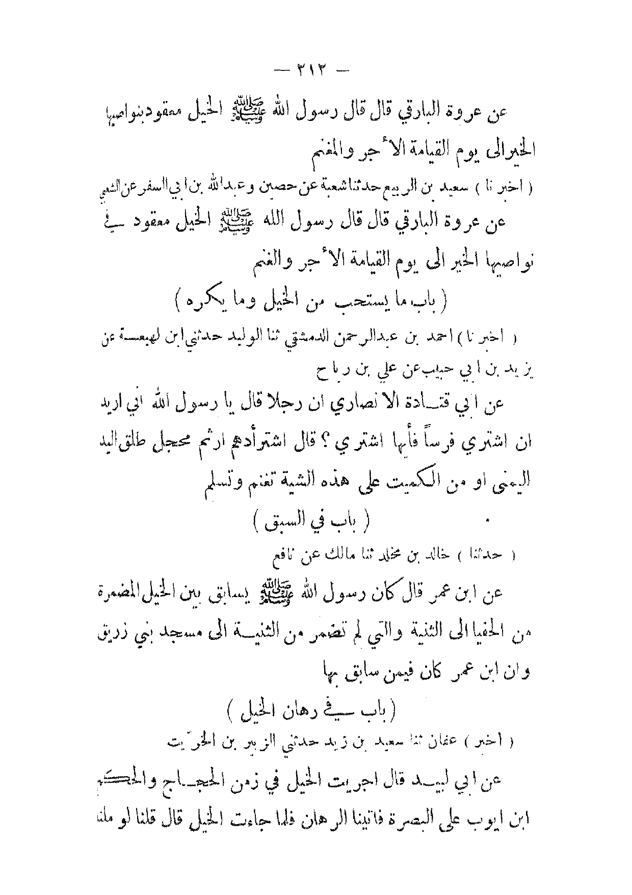 [ 212 ] عن عروة البارقي قال قال رسول الله صلى الله عليه وسلم الخيل معقود بنواصيها الخير إلى يوم القيامة الاجر والمغنم