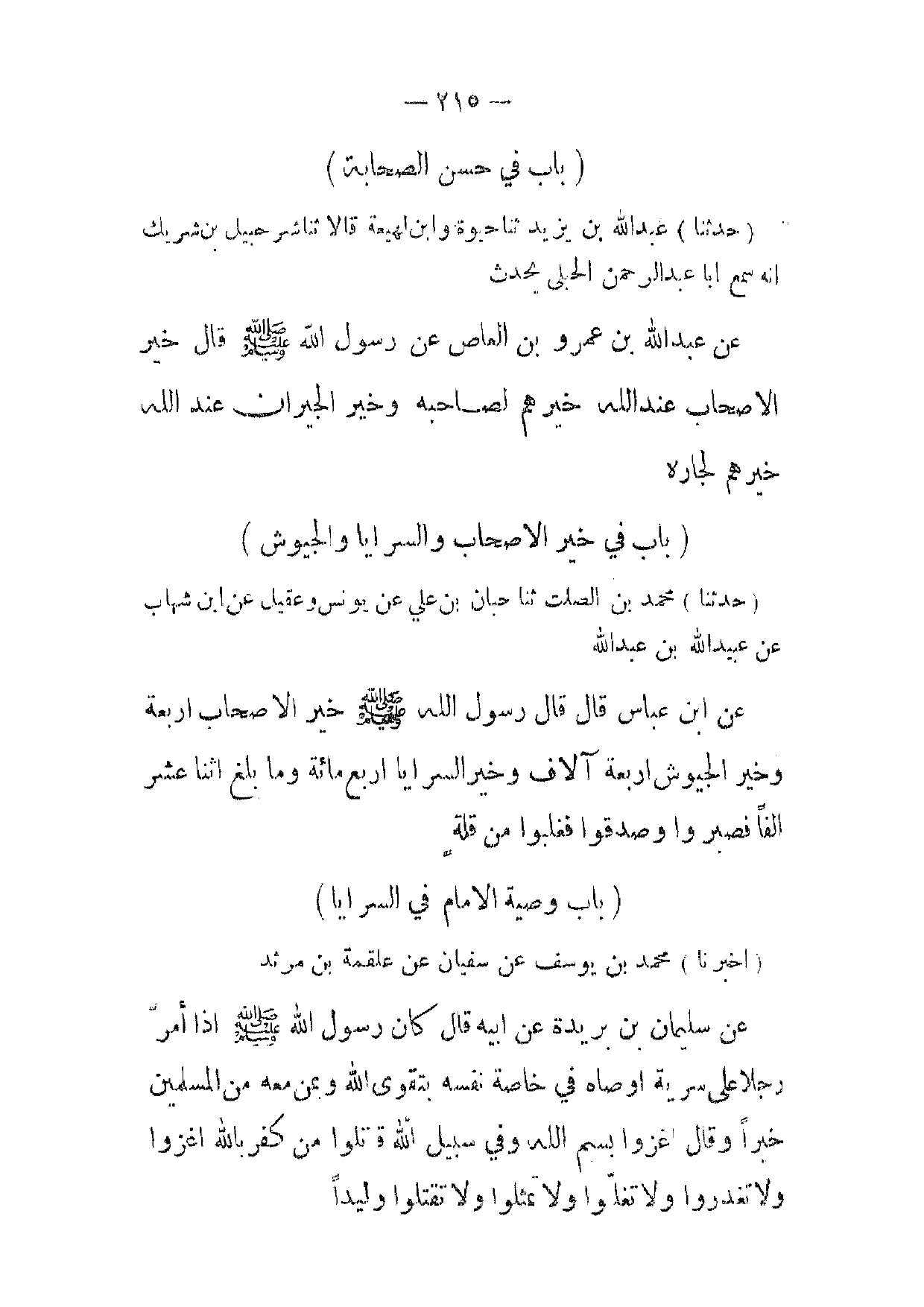 (أخبرنا) محمد بن يوسف عن سفيان عن علقمة بن مرثد عن سليمان بن بريدة عن ابيه قال كان رسول الله صلى الله عليه وآله إذا أمر رجلا على سرية اوصاه في خاصة نفسه بتقوى الله وبمن معه من المسلمين خيرا وقال اغزوا بسم الله وفي سبيل الله قاتلوا من كفر بالله اغزوا ولا تغدروا ولا تغلوا ولا تمثلوا ولا تقتلوا وليدا
