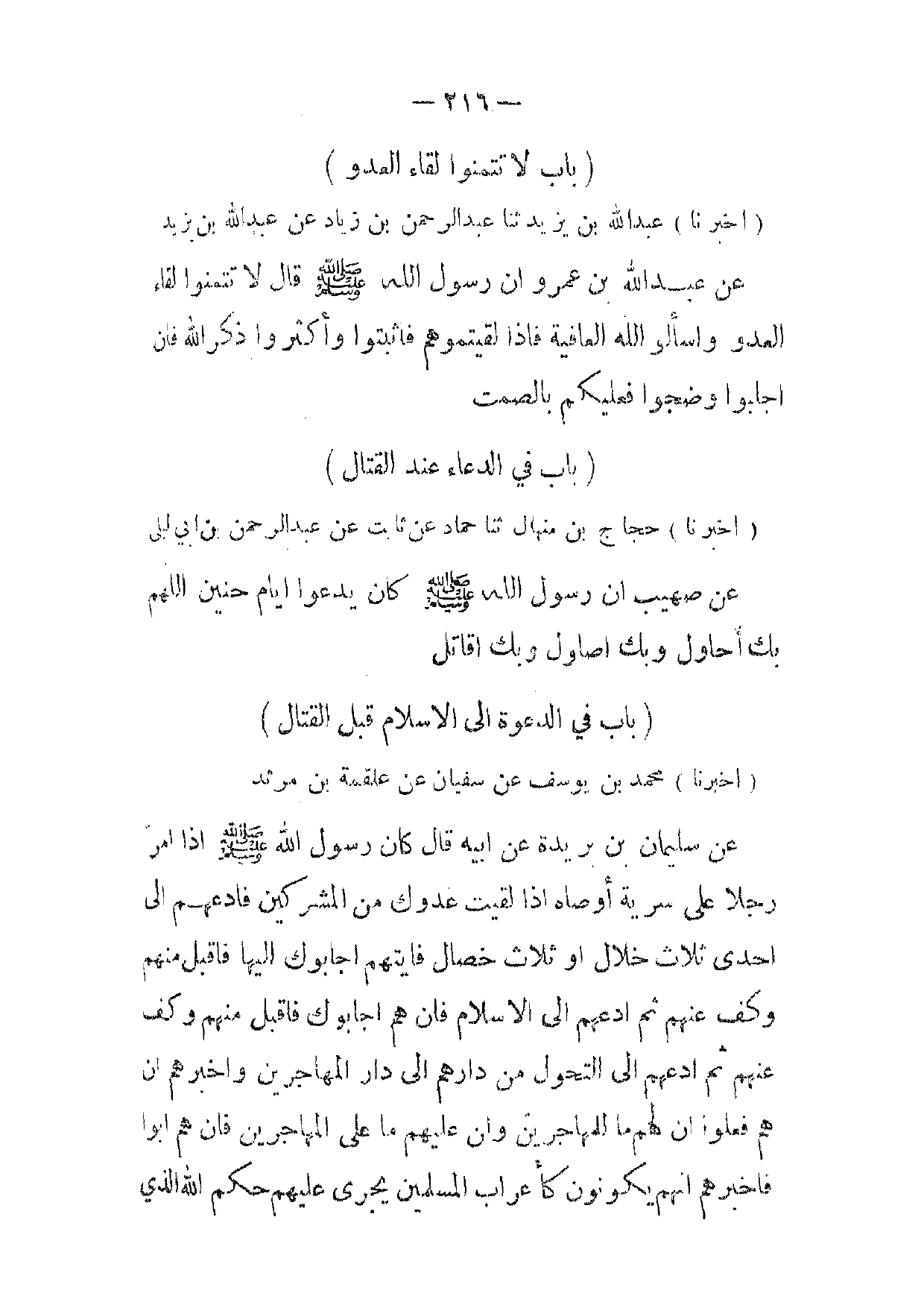 (أخبرنا) عبد الله بن يزيد ثنا عبد الرحمن بن زياد عن عبد الله بن يزيد عن عبد الله بن عمرو ان رسول الله صلى الله عليه وآله قال لا تتمنوا لقاء العدو واسألو الله العافية فإذا لقيتموهم فاثبتوا وأكثروا ذكر الله فان اجلبوا وضجوا فعليكم بالصمت