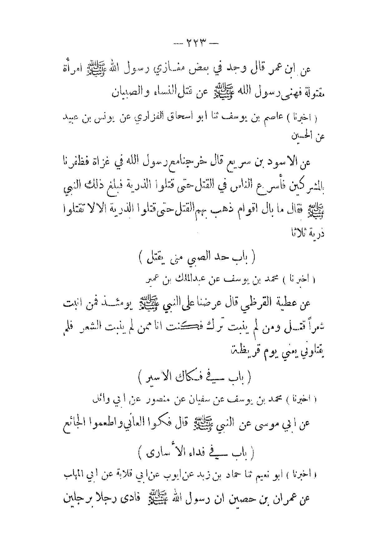 (أخبرنا) عاصم بن يوسف ثنا أبو اسحاق الفزاري عن يونس بن عبيد عن الحسين عن الاسود بن سريع قال خرجنا مع رسول الله في غزاة فظفرنا بالمشركين فأسرع الناس في القتل حتى قتلوا الذرية فبلغ ذلك النبي صلى الله عليه وسلم فقال ما بال اقوام ذهب بهم القتل حتى قتلوا الذرية الا لا تقتلوا ذرية ثلاثا