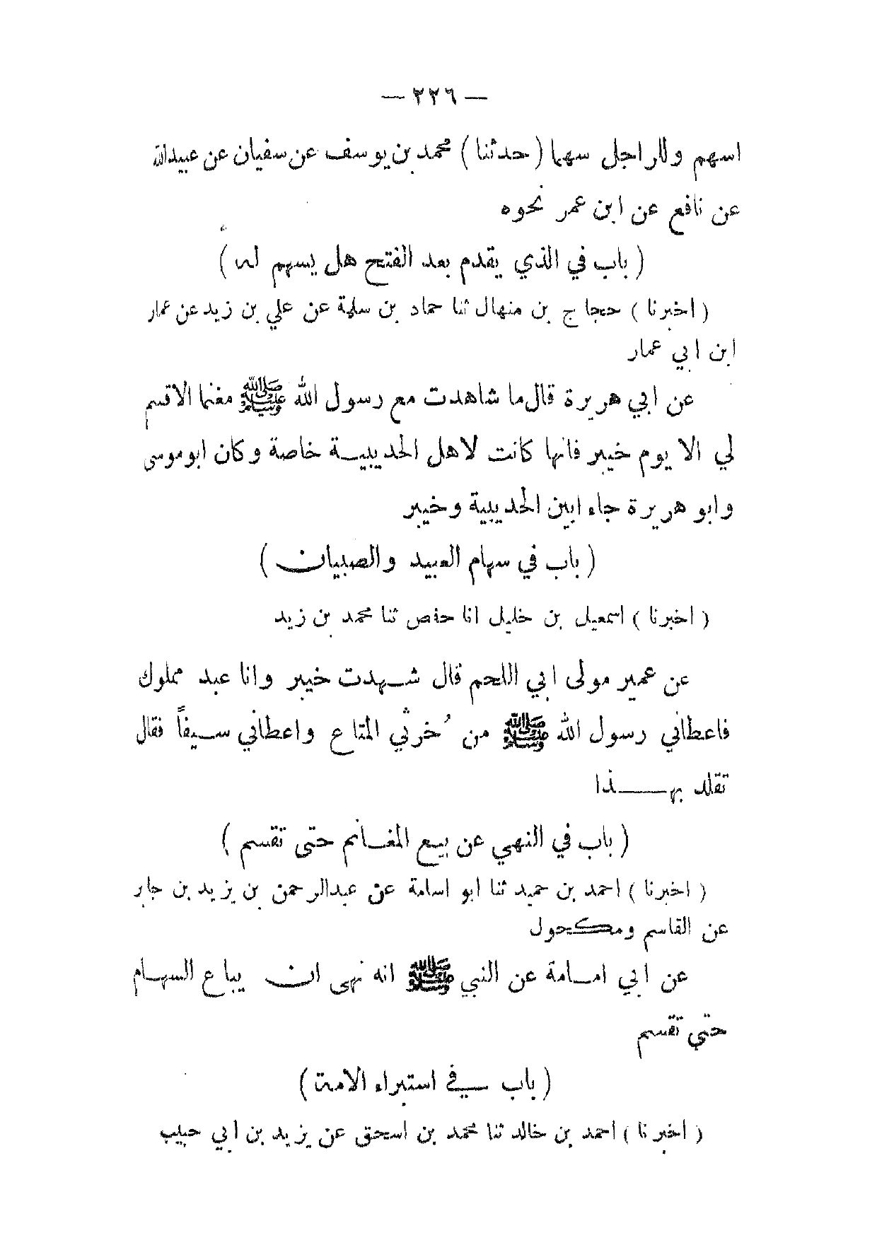 (أخبرنا) حجاج بن منهال ثنا حماد بن سلمة عن علي بن زيد عن عمار ابن ابي عمار عن ابي هريرة قال ما شاهدت مع رسول الله صلى الله عليه وسلم مغنما الاقسم لي الا يوم خيبر فانها كانت لاهل الحديبية خاصة وكان أبو موسى وابو هريرة جاء ابين الحديبية وخيبر