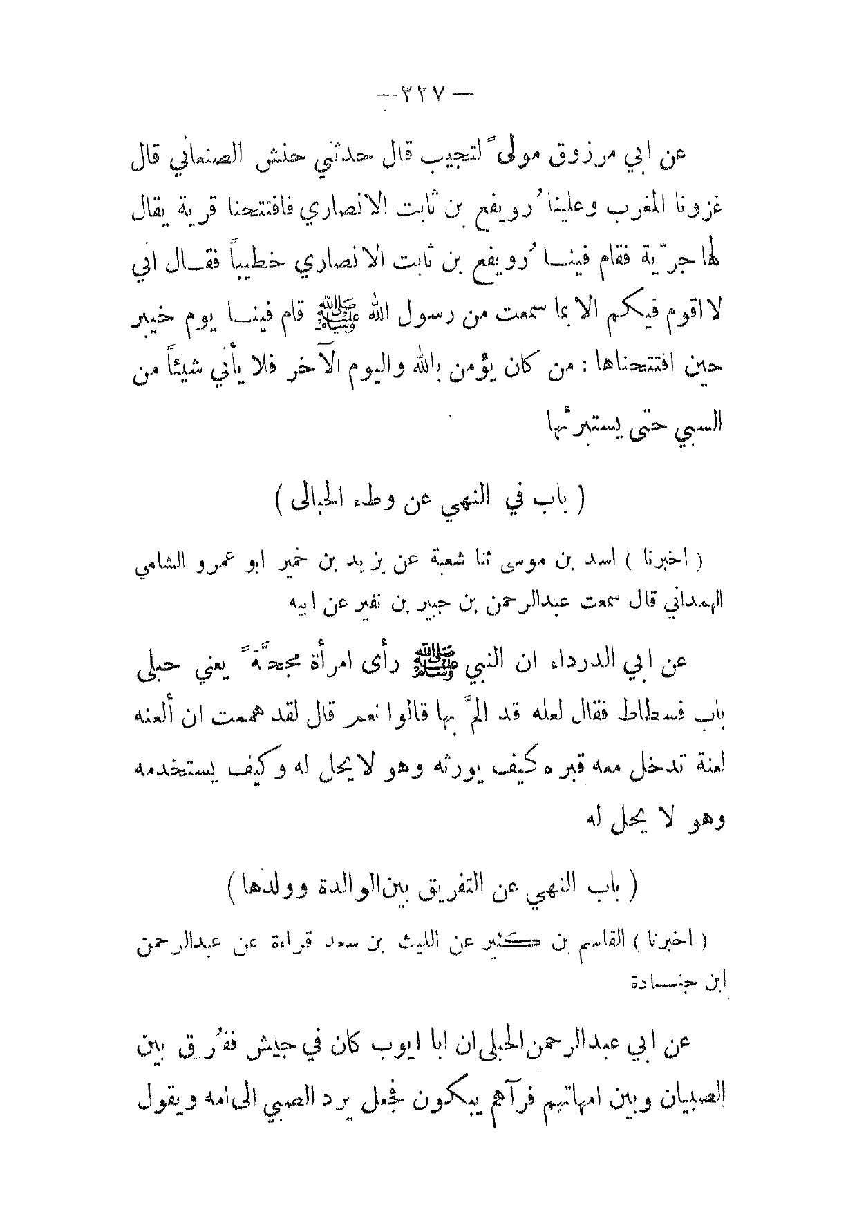 [ 227 ] عن ابي مرزوق مولى لتجيب قال حدثني حنش الصنعاني قال غزونا المغرب وعلينا رويفع بن ثابت الانصاري فافتتحنا قرية يقال لها جرية فقام فينا رويفع بن ثابت الانصاري خطيبا فقال اني لا اقوم فيكم الا بما سمعت من رسول الله صلى الله عليه وسلم قام فينا يوم خيبر حين افتتحناها : من كان يؤمن بالله واليوم الآخر فلا يأتي شيئا من السبي حتى يستبرئها
