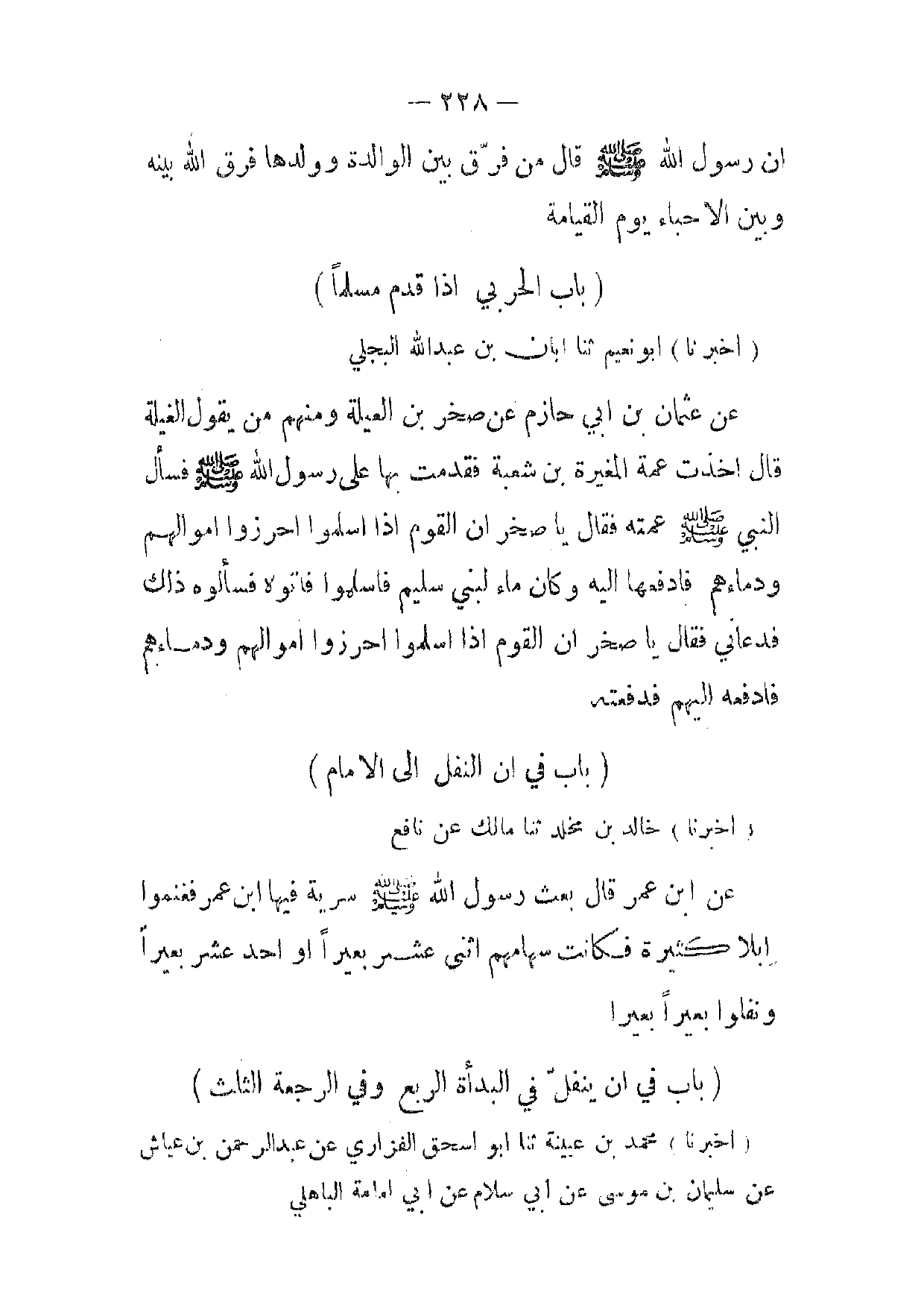 [ 228 ] ان رسول الله صلى الله عليه وسلم قال من فرق بين الوالدة وولدها فرق الله بينه وبين الاحباء يوم القيامة