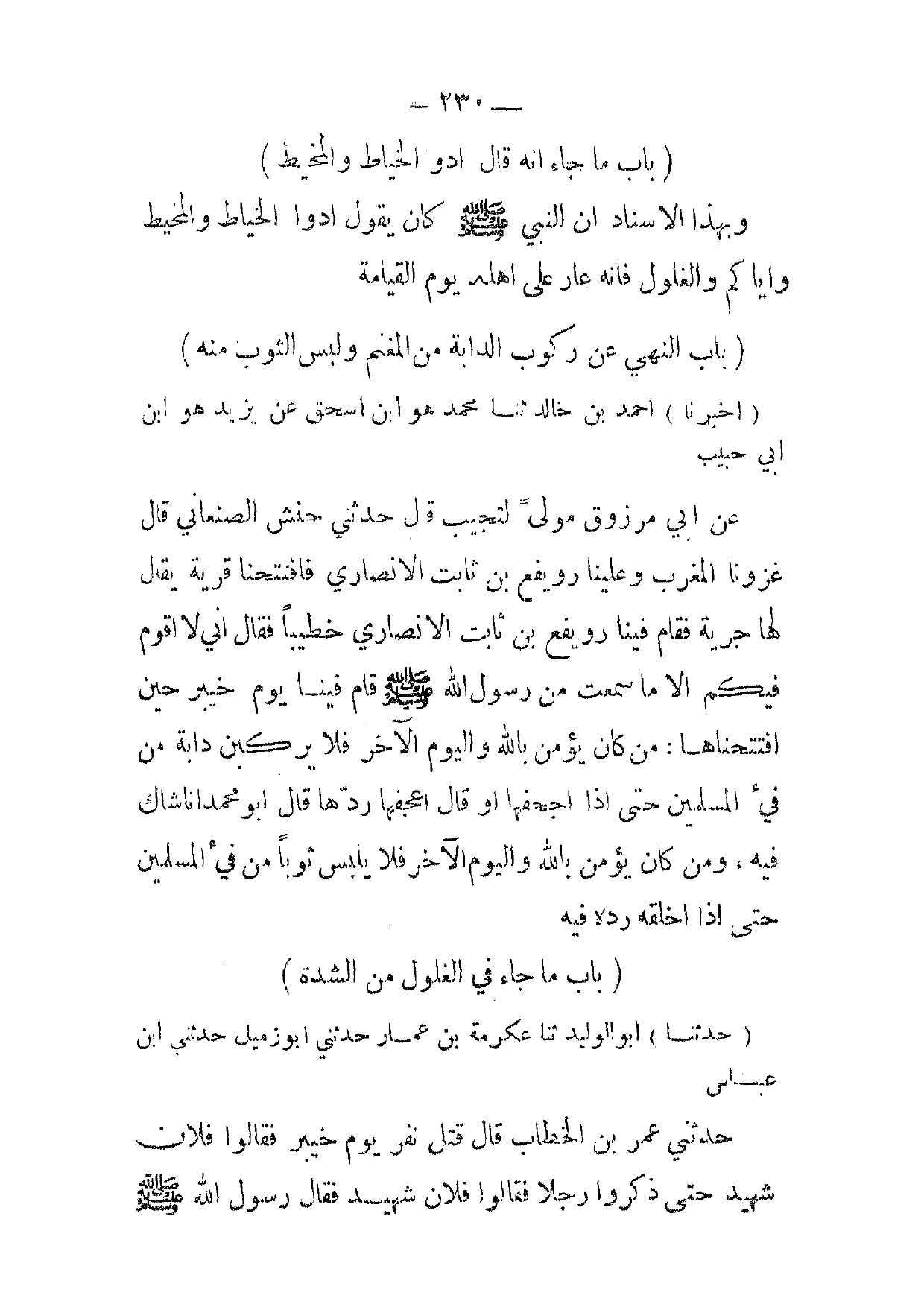 (باب ما جاء انه قال ادو الخياط والمخيط) وبهذا الاسناد ان النبي صلى الله عليه وسلم كان يقول ادوا الخياط والمخيط واياكم والغلول فانه عار على الهله يوم القيامة