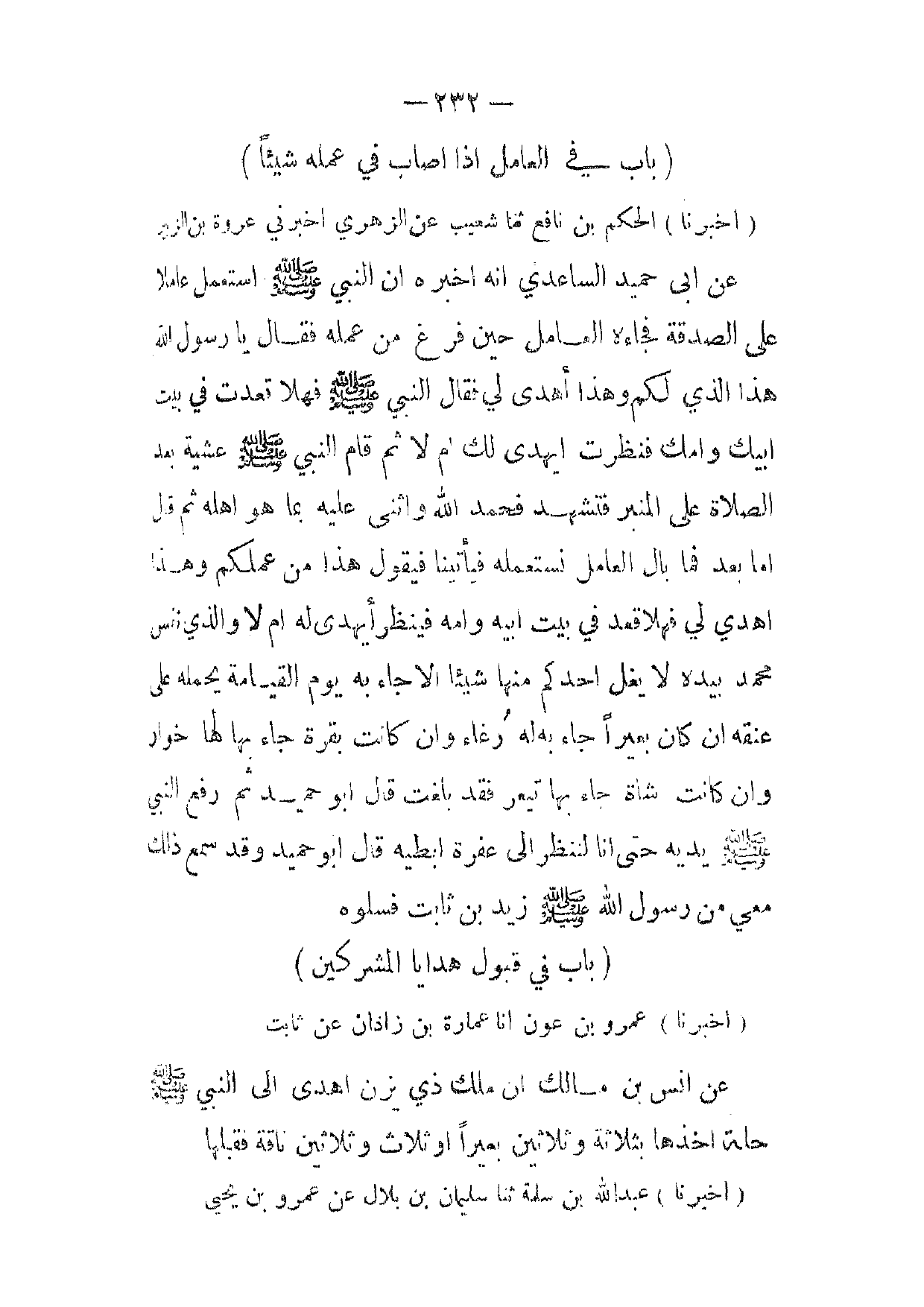 (أخبرنا) الحكم بن نافع ثنا شعيب عن الزهري اخبرني عروة بن الزبير عن ابى حميد الساعدي انه اخبره ان النبي صلى الله عليه وسلم استعمل عاملا على الصدقة فجاءه العامل حين فرغ من عمله فقال يا رسول الله هذا الذي لكم وهذا أهدى لي فقال النبي صلى الله عليه وسلم فهلا قعدت في بيت ابيك وامك فنظرت ايهدى لك ام لا ثم قام النبي صلى الله عليه وسلم عشية بعد الصلاة على المنبر فتشهد فحمد الله واثنى عليه بما هو اهله ثم قال اما بعد فما بال العامل نستعمله فيأتينا فيقول هذا من عملكم وهذا اهدي لي فهلا قعد في بيت ابيه وامه فينظر أيهدى له ام لا والذي نفس محمد بيده لا يغل احدكم منها شيئا الا جاء به يوم القيامة يحمله على عنقه ان كان بعيرا جاء به له رغاء وان كانت بقرة جاء بها لها خوار وان كانت شاة جاء بها تيعر فقد بلغت قال أبو حميد ثم رفع النبي صلى الله عليه وسلم يديه حتى انا لننظر إلى عفرة ابطيه قال أبو حميد وقد سمع ذلك معي من رسول الله صلى الله عليه وسلم زيد بن ثابت فسلوه