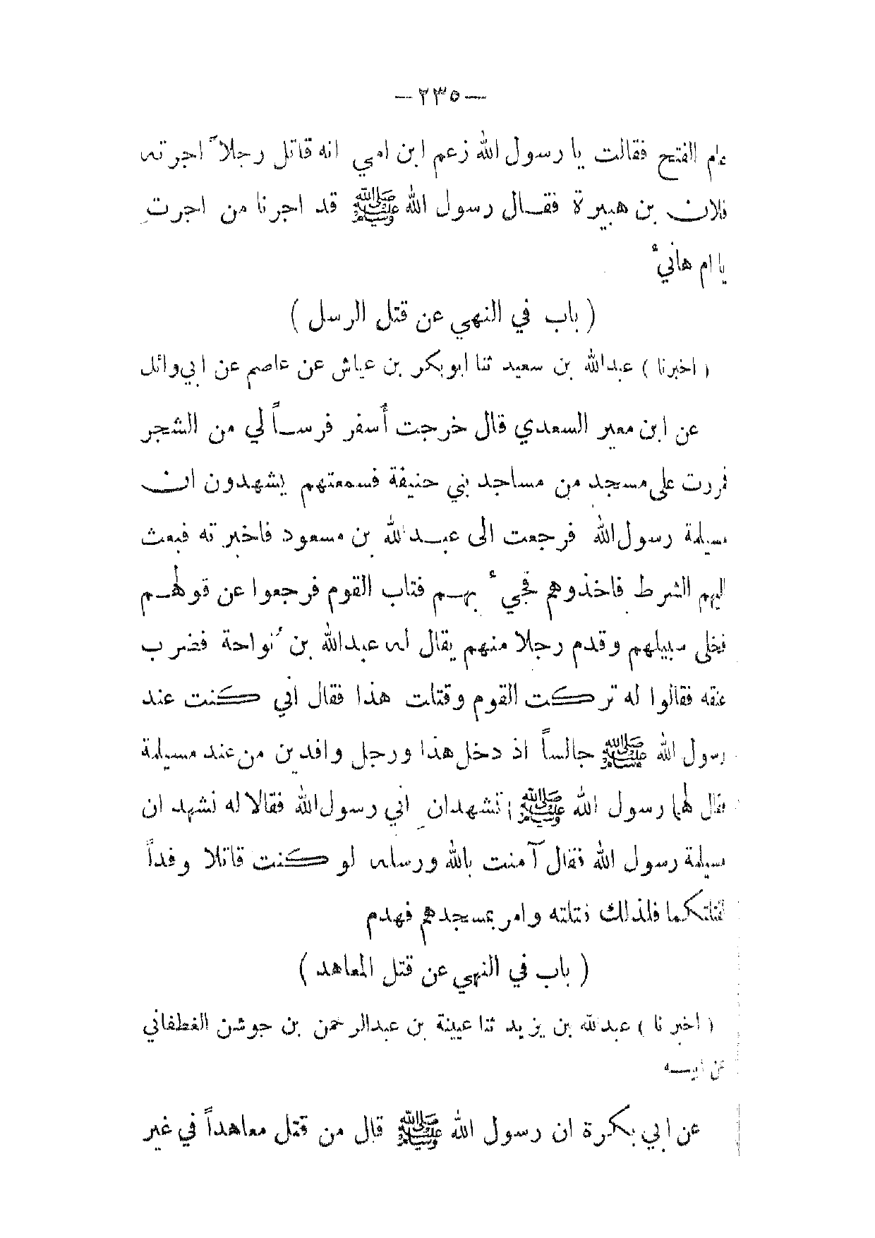 (أخبرنا) عبد الله بن سعيد ثنا أبو بكر بن عياش عن عاصم عن ابي وائل عن ابن معير السعدي قال خرجت أسفر فرسا لي من الشجر فمررت على مسجد من مساجد بني حنيفة فسمعتهم يشهدون ان مسيلمة رسول الله فرجعت إلى عبد الله بن مسعود فاخبرته فبعث إليهم الشرط فاخذوهم فجئ بهم فتاب القوم فرجعوا عن قولهم فخلى سبيلهم وقدم رجلا منهم يقال له عبد الله بن نواحة فضرب عنقه فقالوا له تركت القوم وقتلت هذا فقال اني كنت عند رسول الله صلى الله عليه وسلم جالسا إذ دخل هذا ورجل وافدين من عند مسيلمة فقال لهما رسول الله صلى الله عليه وسلم اتشهدان اني رسول الله فقالا له نشهد ان مسيلمة رسول الله فقال آمنت بالله ورسله لو كنت قاتلا وفدا لقتلتكما فلذلك فتلته وامر بمسجدهم فهدم