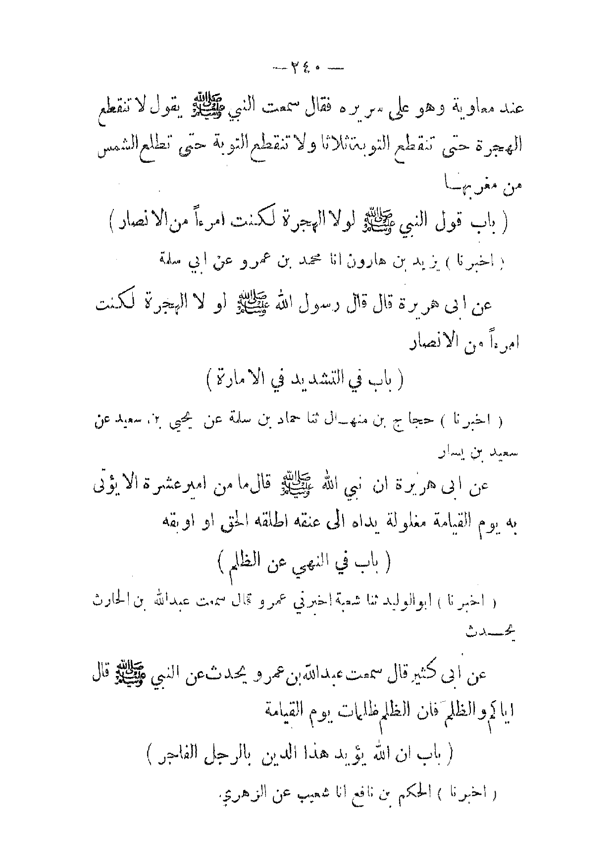 [ 240 ] عند معاوية وهو على سريره فقال سمعت النبي صلى الله عليه وسلم يقول لا تنقطع الهجرة حتى تنقطع التوبة ثلاثا ولا تنقطع التوبة حتى تطلع الشمس من مغربها