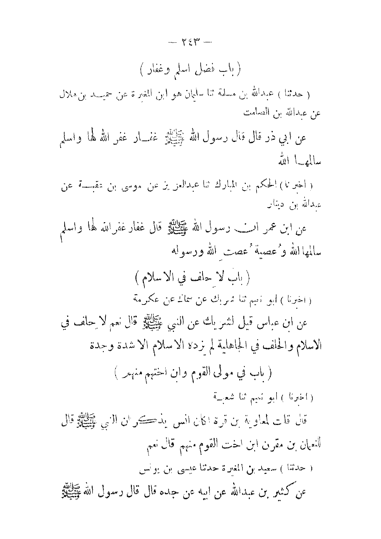 (حدثنا) عبد الله بن مسلمة ثنا سليمان هو ابن المغيرة عن حميد بن هلال عن عبد الله بن الصامت عن ابي ذر قال قال رسول الله صلى الله عليه وسلم غفار غفر الله لها واسلم سالمها الله