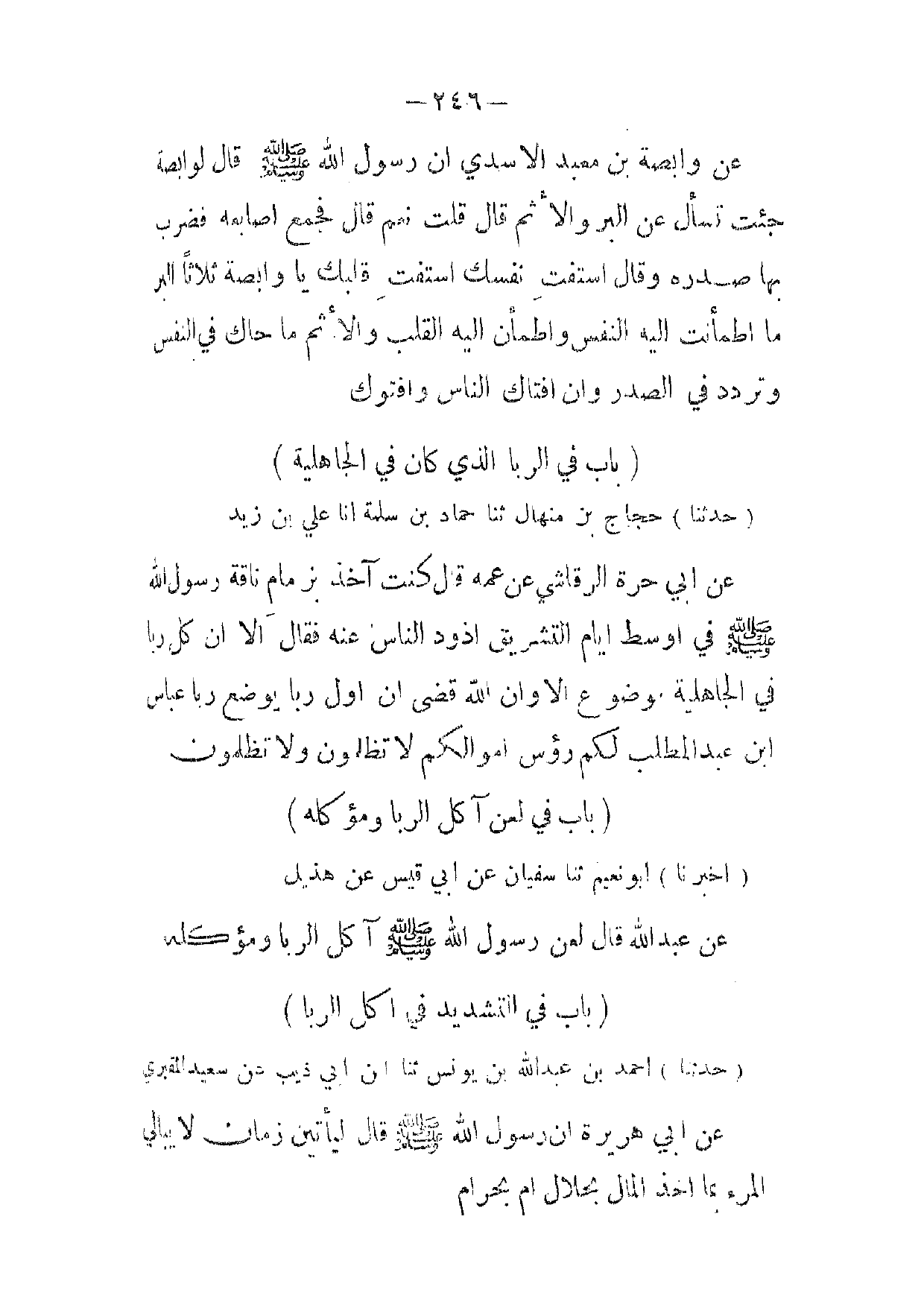 [ 246 ] عن وابصة بن معبد الاسدي ان رسول الله صلى الله عليه وسلم قال لو ابصة جئت تسأل عن البر والاثم قال قلت نعم قال فجمع اصابعه فضرب بها صدره وقال استفت نفسك استفت قلبك يا وابصة ثلاثا البر ما اطمأنت إليه النفس واطمأن إليه القلب والاثم ما حاك في النفس وتردد في الصدر وان افتاك الناس وافتوك