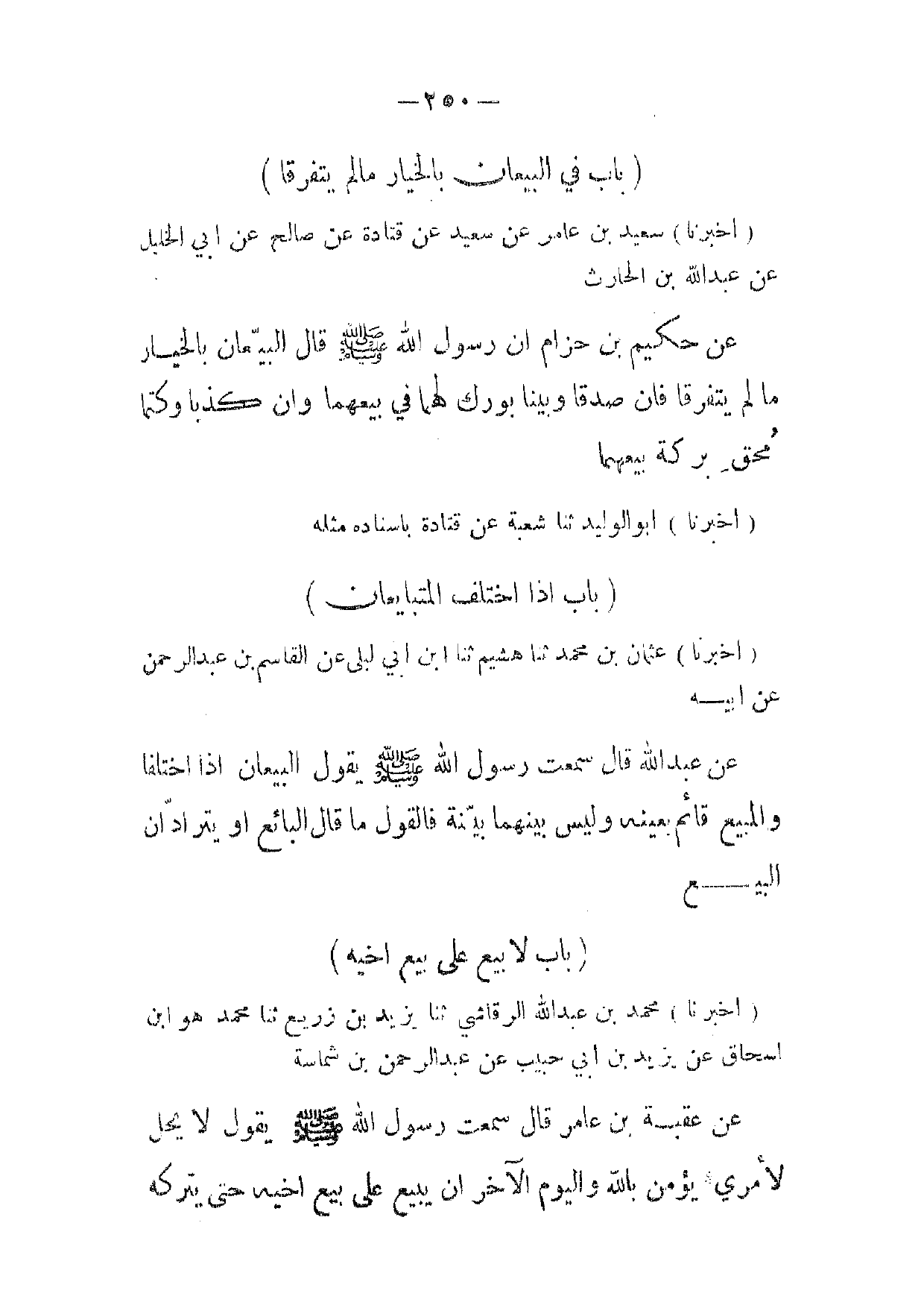 (أخبرنا) محمد بن عبد الله الرقاشي ثنا يزيد بن زريع ثنا محمد هو ابن اسحاق عن يزيد بن ابي حبيب عن عبد الرحمن بن شماسة عن عقبة بن عامر قال سمعت رسول الله صلى الله عليه وسلم يقول لا يحل لامرئ يؤمن بالله واليوم الآخر ان يبيع على بيع اخيه حتى يتركه