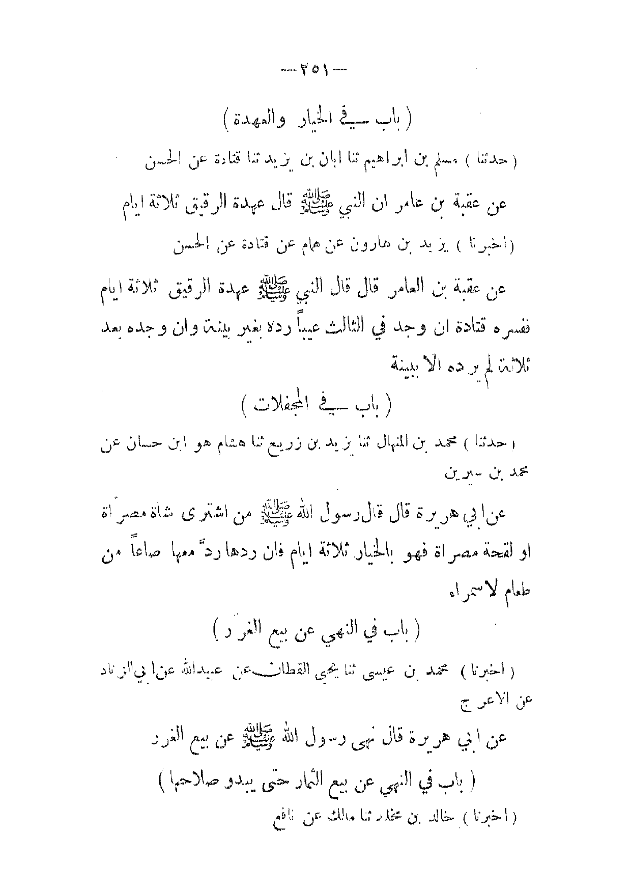 (أخبرنا) محمد بن عيسى ثنا يحيى القطان عن عبيدالله عن ابي الزناد عن الاعرج عن ابي هريرة قال نهى رسول الله صلى الله عليه وسلم عن بيع الغرر