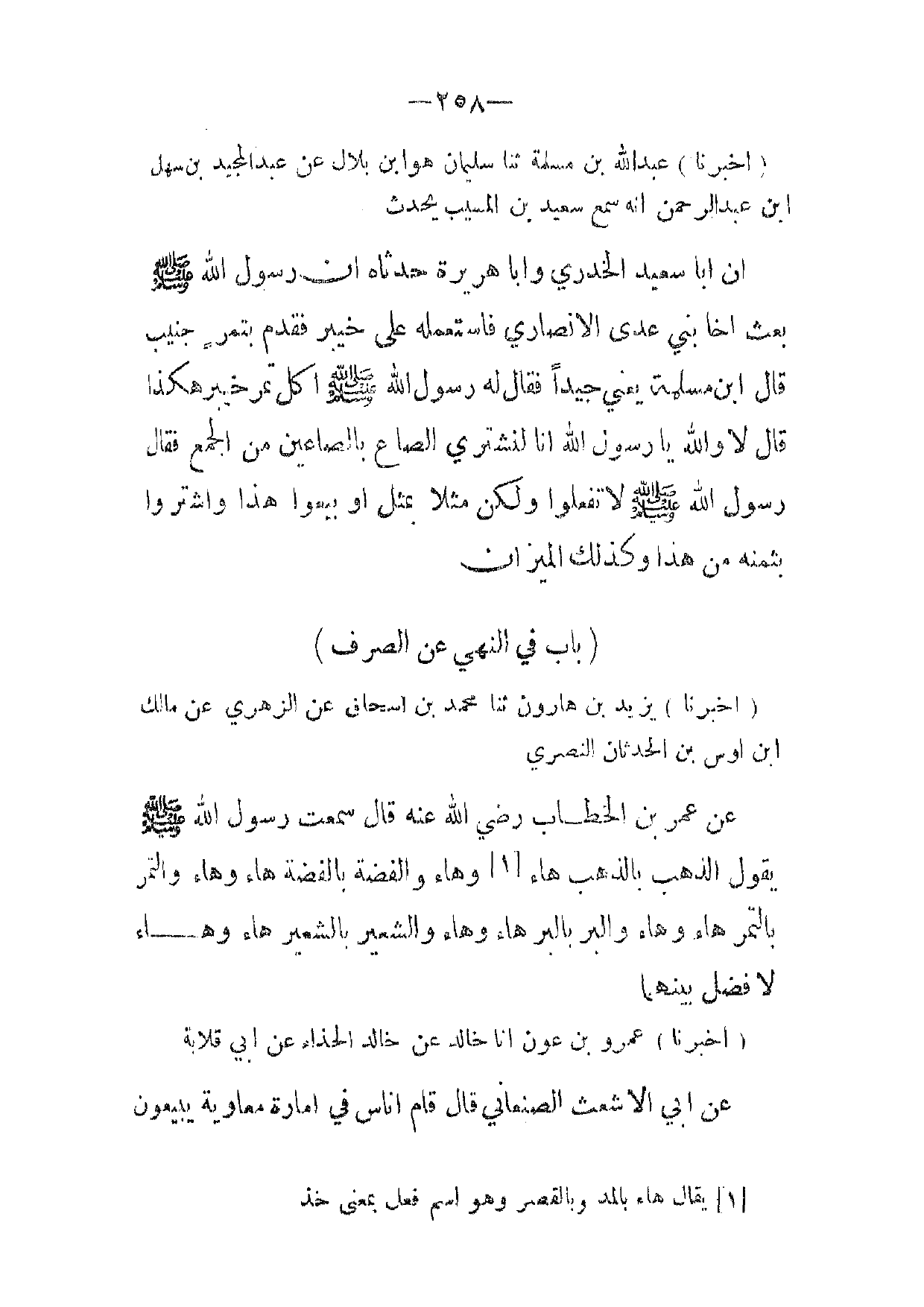 (أخبرنا) عبد الله بن مسلمة ثنا سليمان هو ابن بلال عن عبد المجيد بن سهل ابن عبد الرحمن انه سمع سعيد بن المسيب يحدث ان ابا سعيد الخدري وابا هريرة حدثاه ان رسول الله صلى الله عليه وسلم بعث اخا بني عدى الانصاري فاستعمله على خيبر فقدم بتمر جنيب قال ابن مسلمة يعني جيدا فقال له رسول الله صلى الله عليه وسلم اكل تمرخيبر هكذا قال لا والله يا رسول الله انا لنشتري الصاع بالصاعين من الجمع فقال رسول الله صلى الله عليه وسلم لا تفعلوا ولكن مثلا بمثل أو بيعوا هذا واشتروا بثمنه من هذا وكذلك الميزان
