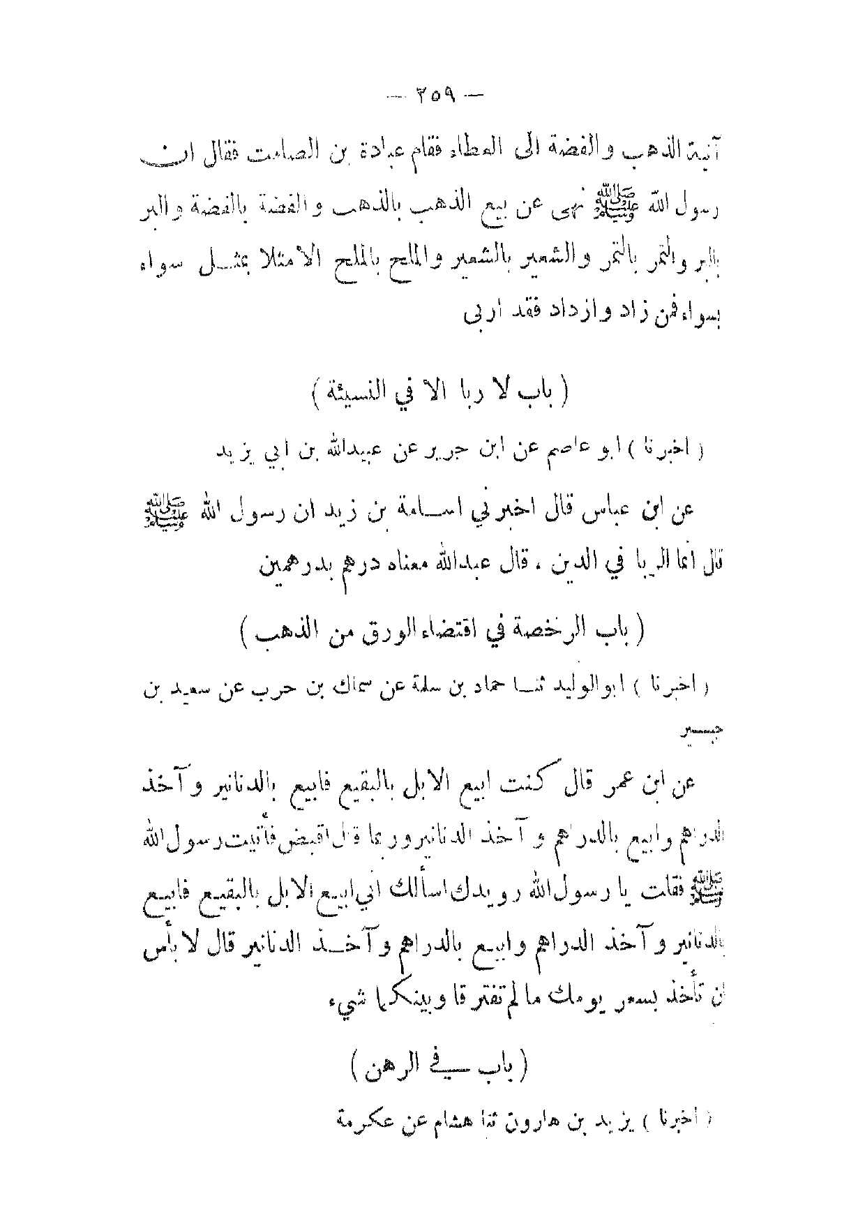 [ 259 ] آنية الذهب والفضة إلى العطاء فقام عبادة بن الصامت فقال ان رسول الله صلى الله عليه وسلم نهى عن بيع الذهب بالذهب والفضة بالفضة والبر بالبر والتمر بالتمر والشعير بالشعير والملح بالملح الا مثلا بمثل سواء بسواء فمن زاد وازداد فقد اربى