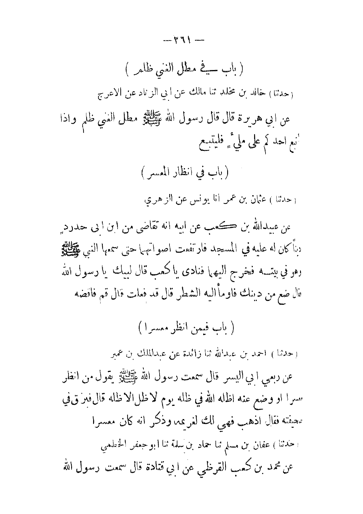 (حدثنا) خالد بن مخلد ثنا مالك عن ابي الزناد عن الاعرج عن ابي هريرة قال قال رسول الله صلى الله عليه وآله مطل الغني ظلم وإذا اتبع احد كم على ملئ فليتبع