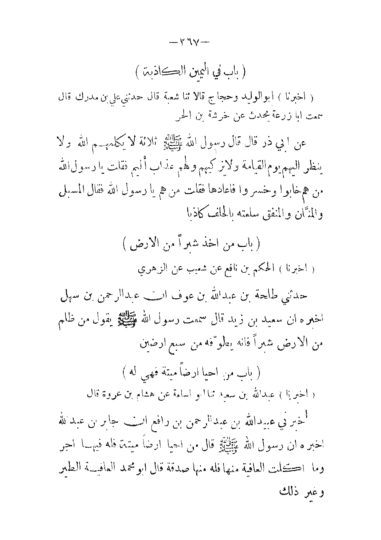 (أخبرنا) أبو الوليد وحجاج قالا ثنا شعبة قال حدثني علي بن مدرك قال سمعت ابا زرعة يحدث عن خرشة بن الحر عن ابي ذر قال قال رسول الله صلى الله عليه وسلم ثلاثة لا يكلمهم الله ولا ينظر إليهم يوم القيامة ولا يزكيهم ولهم عذاب أليم فقلت يا رسول الله من هم خابوا وخسروا فاعادها فقلت من هم يا رسول الله فقال المسبل والمنان والمنفق سلعته بالحلف كاذبا