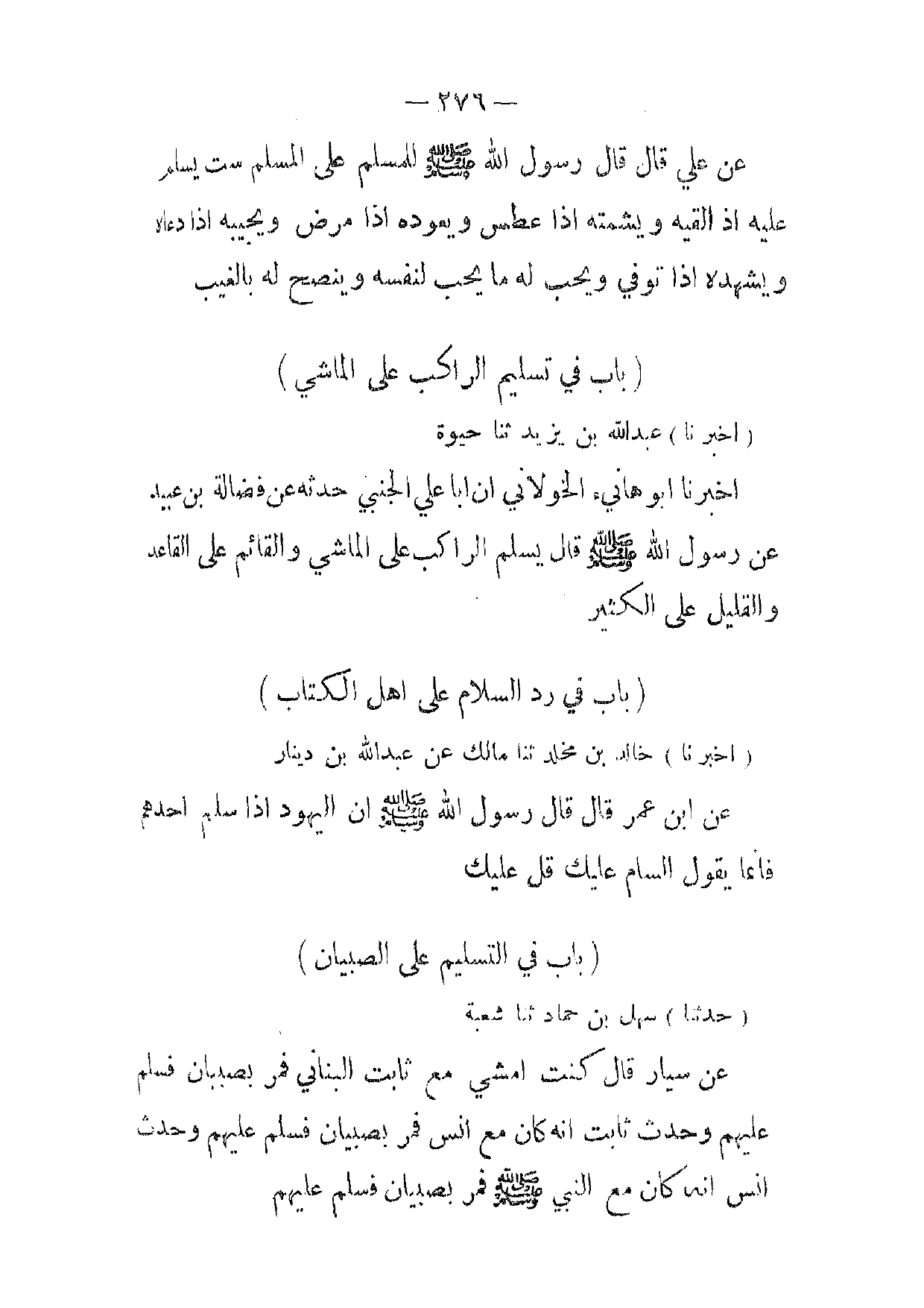(أخبرنا) عبد الله بن يزيد ثنا حيوة اخبرنا أبو هانئ الخولاني ان ابا علي الجنبي حدثه عن فضالة بن عبيد عن رسول الله صلى الله عليه وسلم قال يسلم الراكب على الماشي والقائم على القاعد والقليل على الكثير