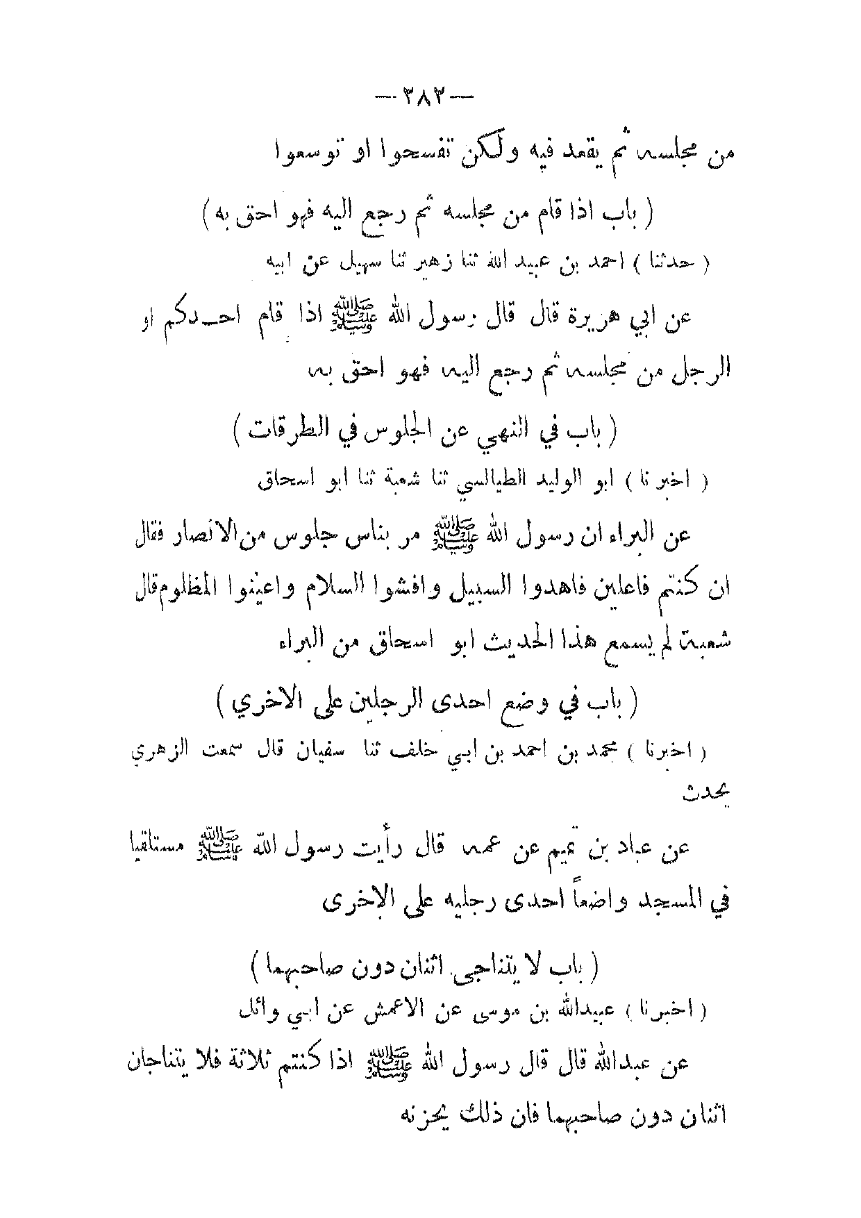 (أخبرنا) عبيدالله بن موسى عن الاعمش عن ابي وائل عن عبد الله قال قال رسول الله صلى الله عليه وآله إذا كنتم ثلاثة فلا يتناجان اثنان دون صاحبهما فان ذلك يحزنه